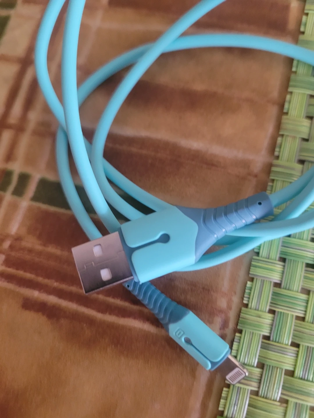 A blue USB to Lightning charging cable is included. It's about 40 inches long and has a small indicator light near the Lightning connector. This cable works with Apple devices.
