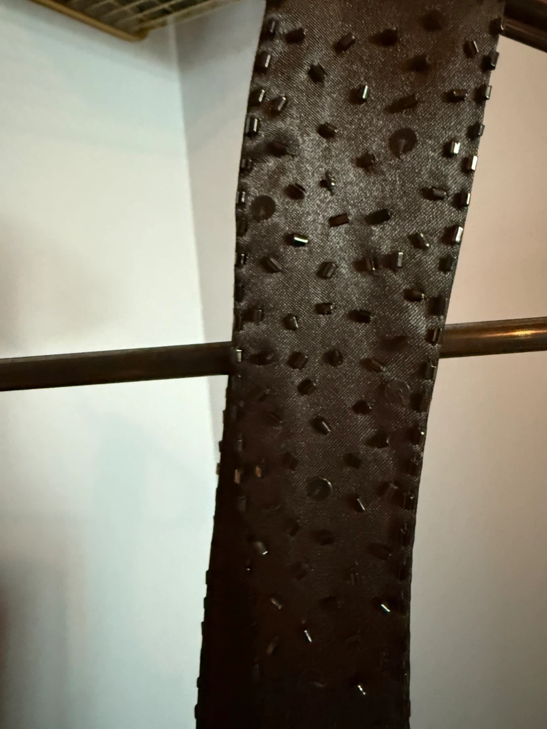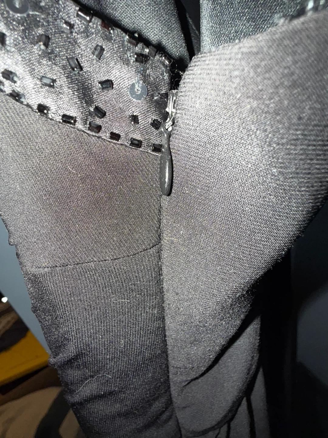 Black sleeveless dress with beaded straps. It has a V-neckline with ruching detail. Purchased from The Bay. Size 12.