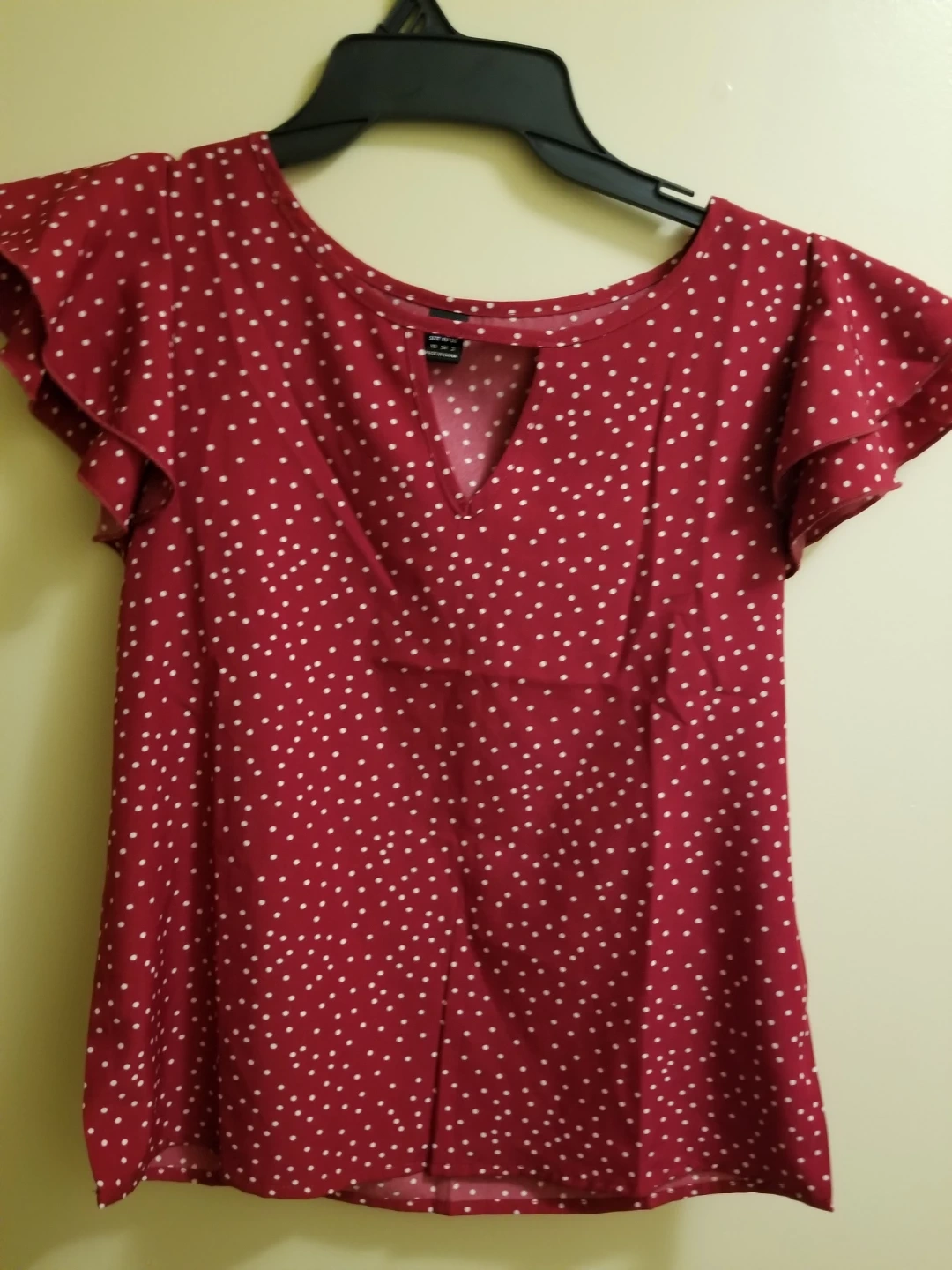 Charming red blouse with a classic white polka dot pattern. It features stylish flutter sleeves and a flattering V-neckline. Material is lightweight and breathable. Size is XS