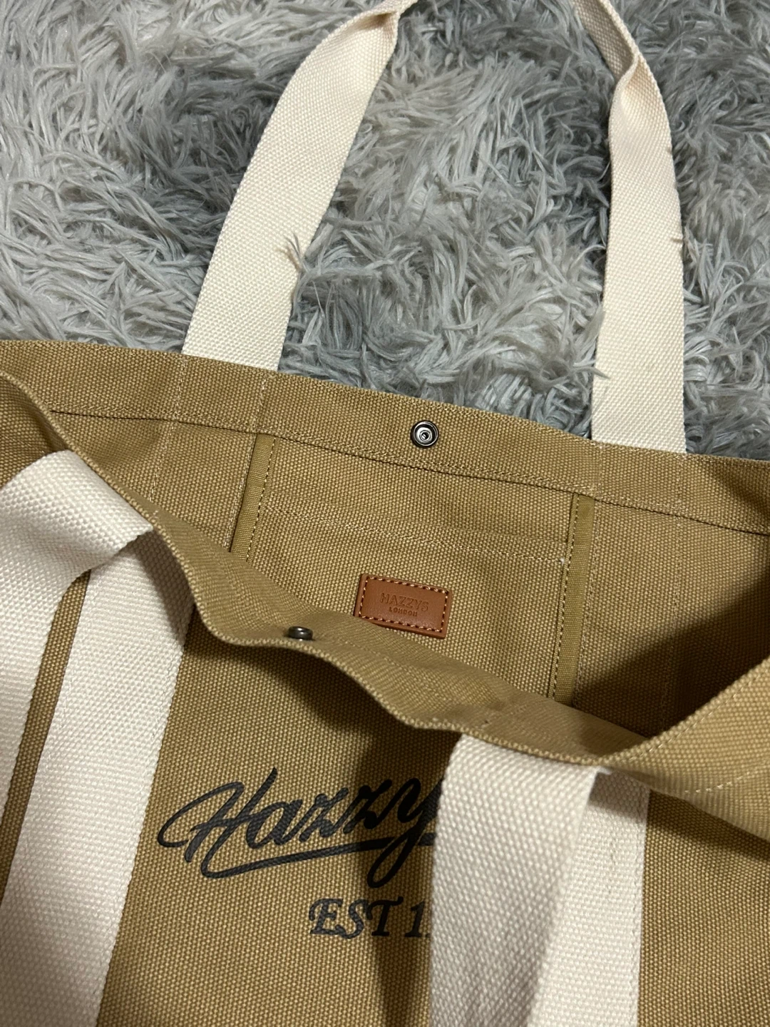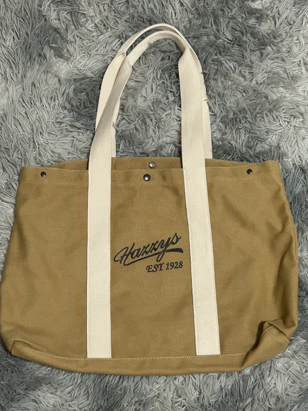 Canvas tote bag with dual straps. Features "Hazzys EST 1928" graphic. It's a durable and practical bag for everyday use.