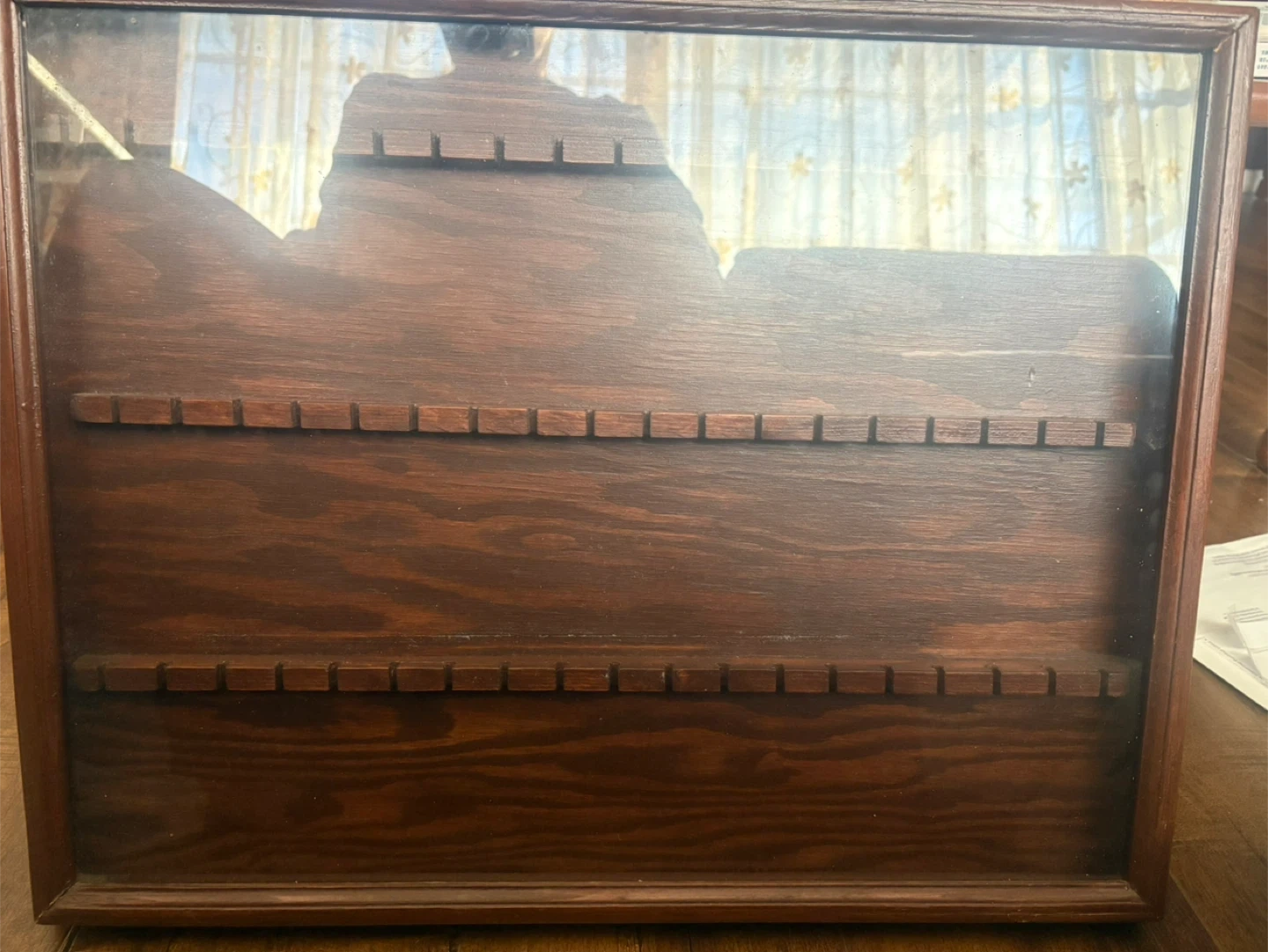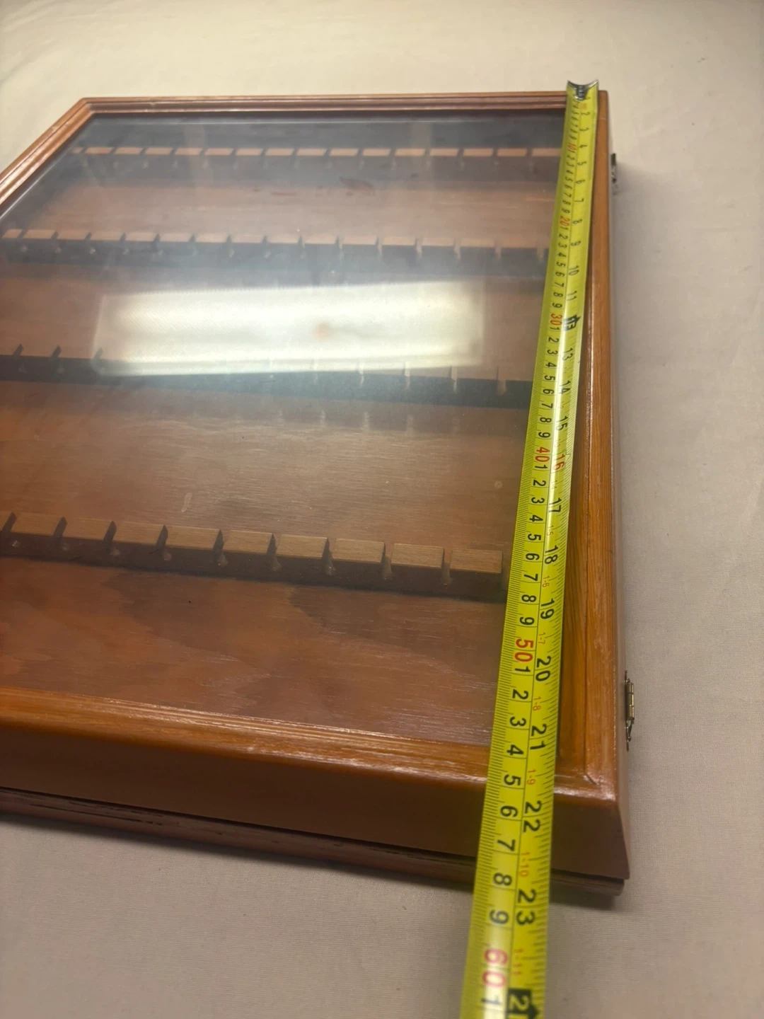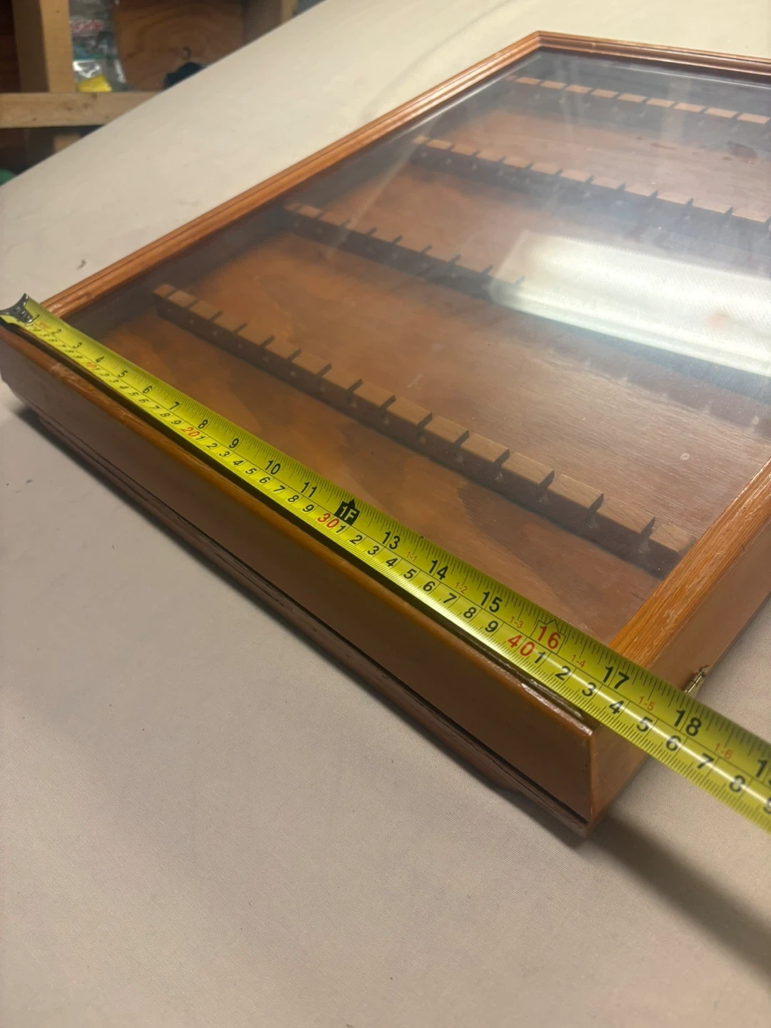Wooden display case with glass top, perfect for showcasing spoons or small collectibles. It has rows with individual slots to keep items secure and organized. Measures approximately 18 inches by 13 inches.