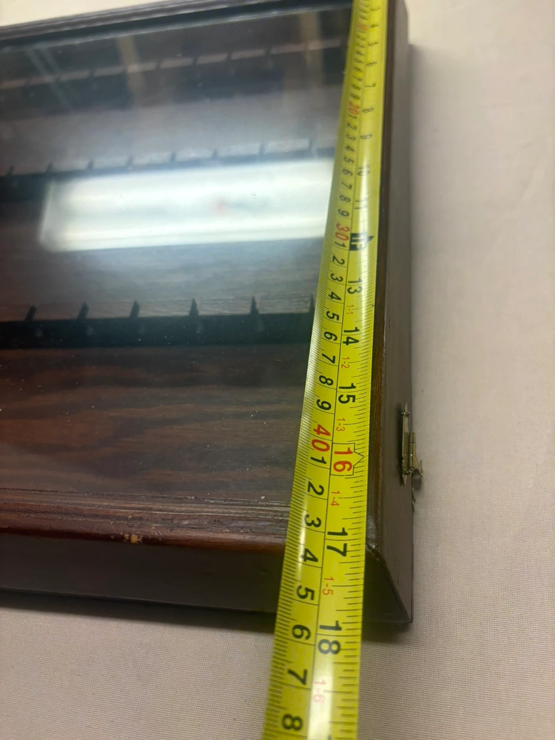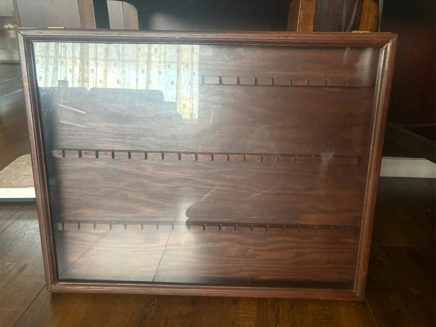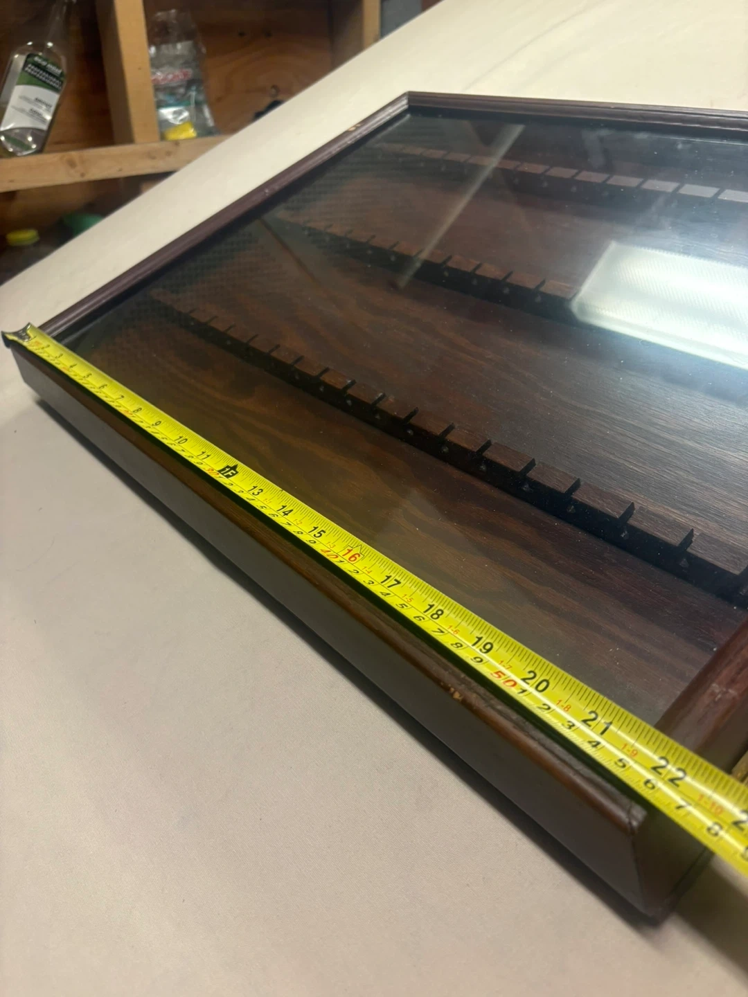 Wooden display case with glass top, perfect for showcasing spoons or small collectibles. It has rows with individual slots to keep items secure and organized. Measures approximately 18 inches by 13 inches.