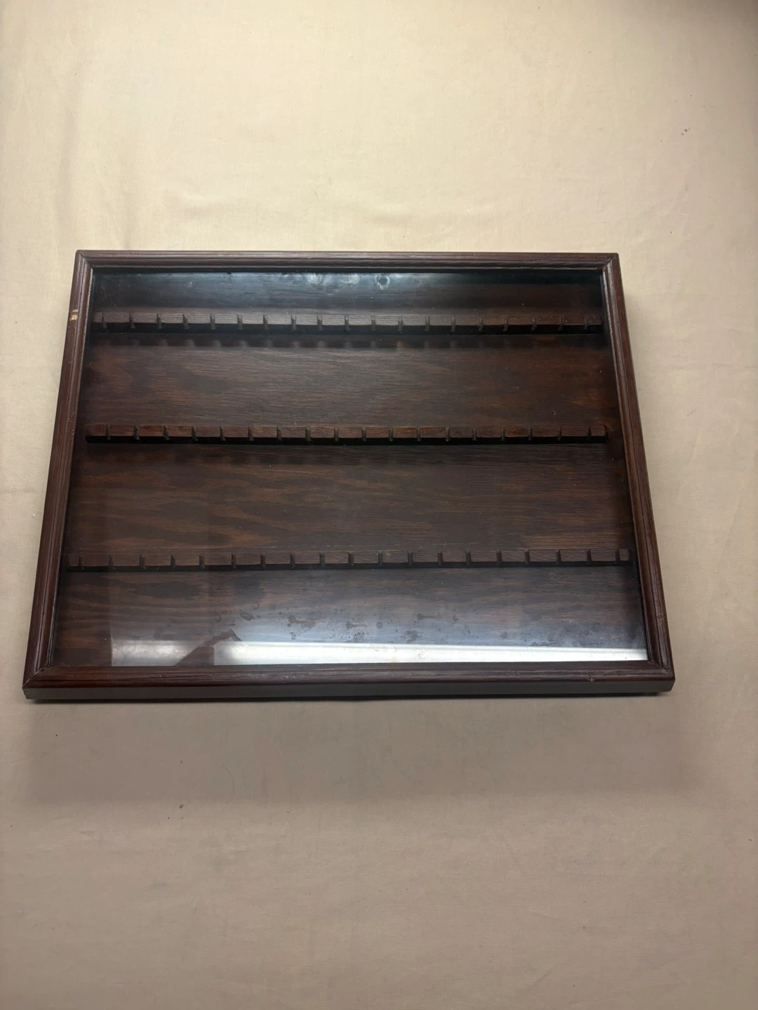 Wooden display case with glass top, perfect for showcasing spoons or small collectibles. It has rows with individual slots to keep items secure and organized. Measures approximately 18 inches by 13 inches.