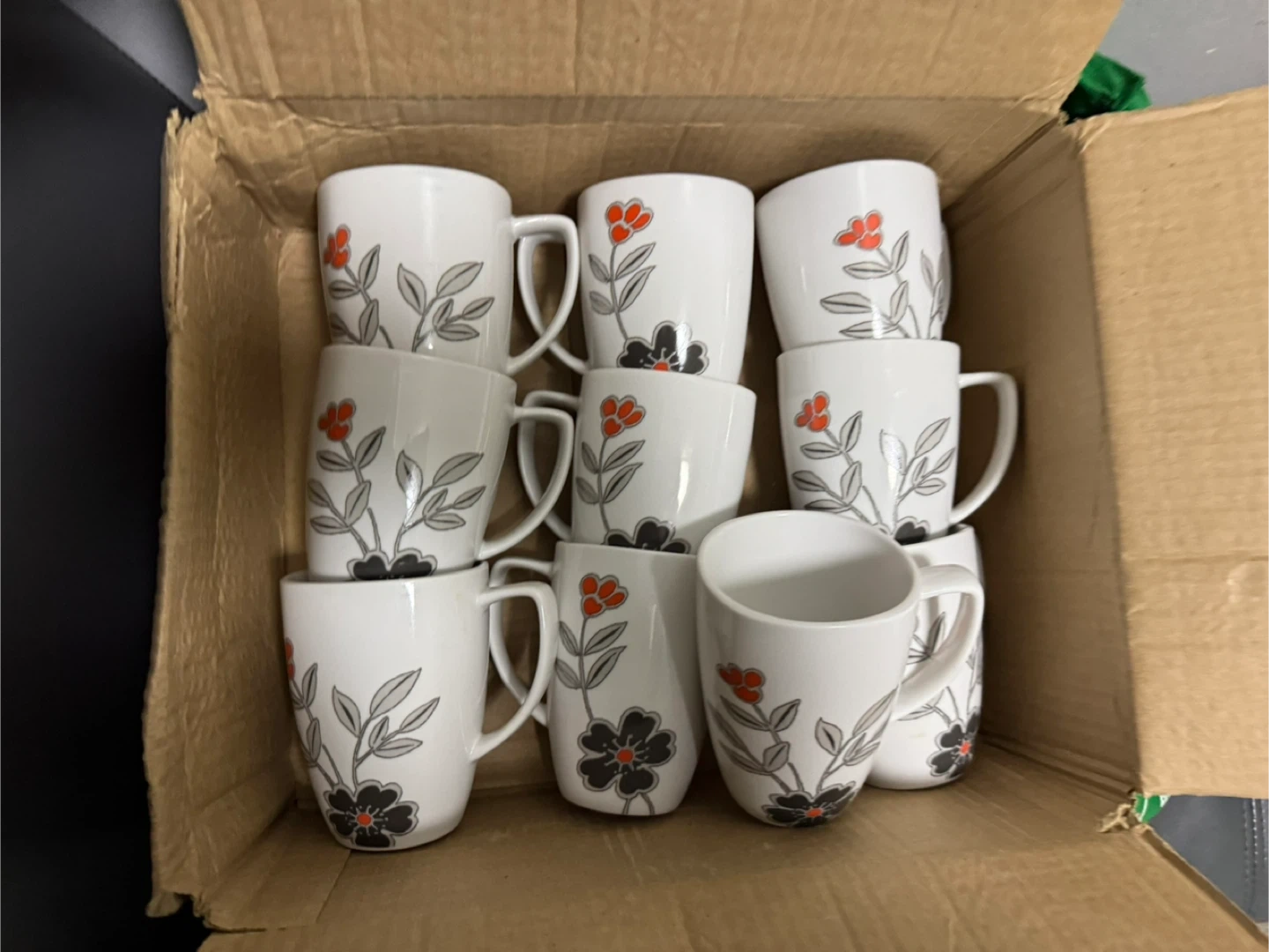 A set of 10 white ceramic mugs featuring a delicate floral design. Each mug has a comfortable handle and a capacity suitable for your favourite beverages. These mugs are perfect for everyday use or for serving guests.