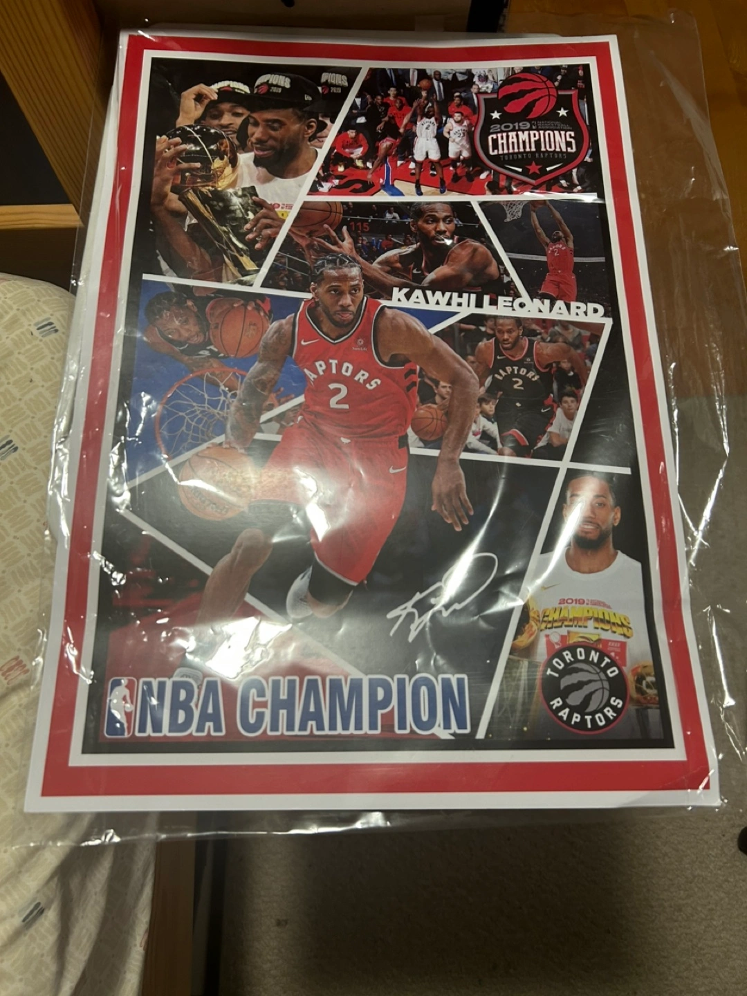 Selling a poster featuring Kawhi Leonard and the Toronto Raptors after their 2019 NBA Championship win! It says 'NBA Champion' at the bottom and has various images of Kawhi Leonard throughout.