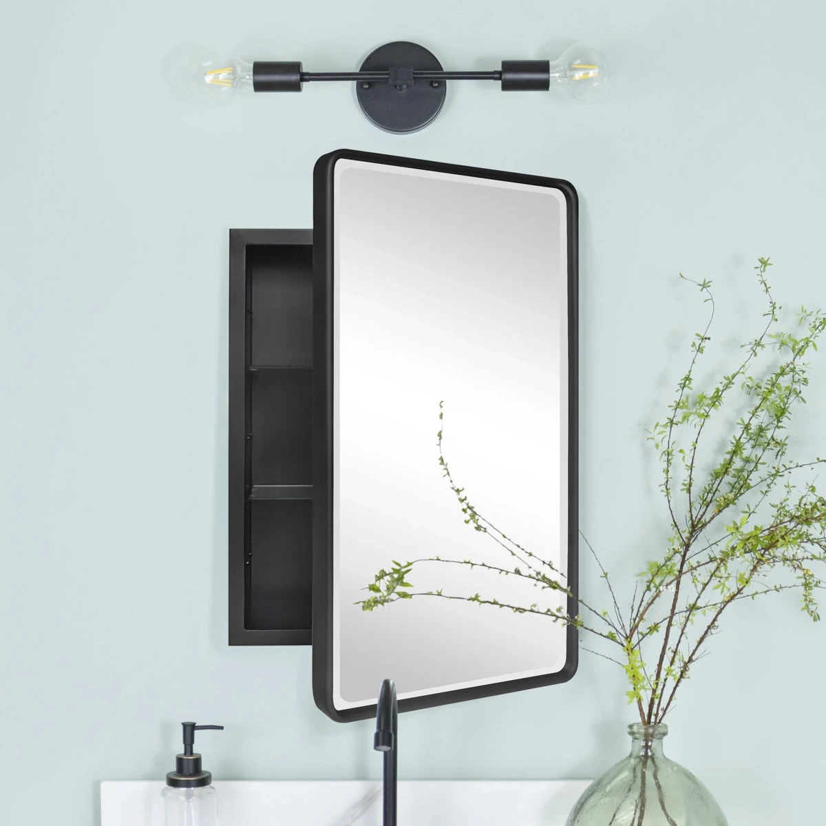 This is a black framed wall mirror with recessed storage. The mirror measures 20 inches wide by 30 inches tall. The cabinet is 17.4 inches wide, 25.2 inches tall, and 3.23 inches deep. It's perfect for organizing bathroom essentials! Bought new for $350 from Wayfair. Taken out of box just to show for photo.