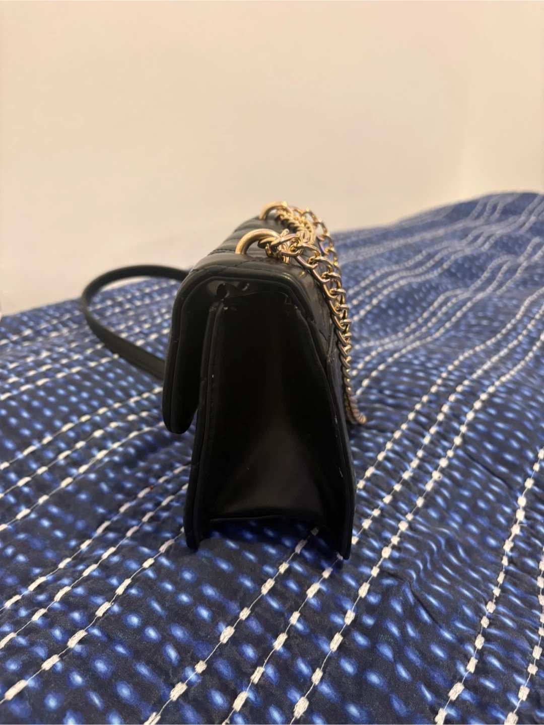 Black quilted crossbody bag from GUESS. Features a gold chain strap and signature lining. It's a compact size, perfect for essentials.