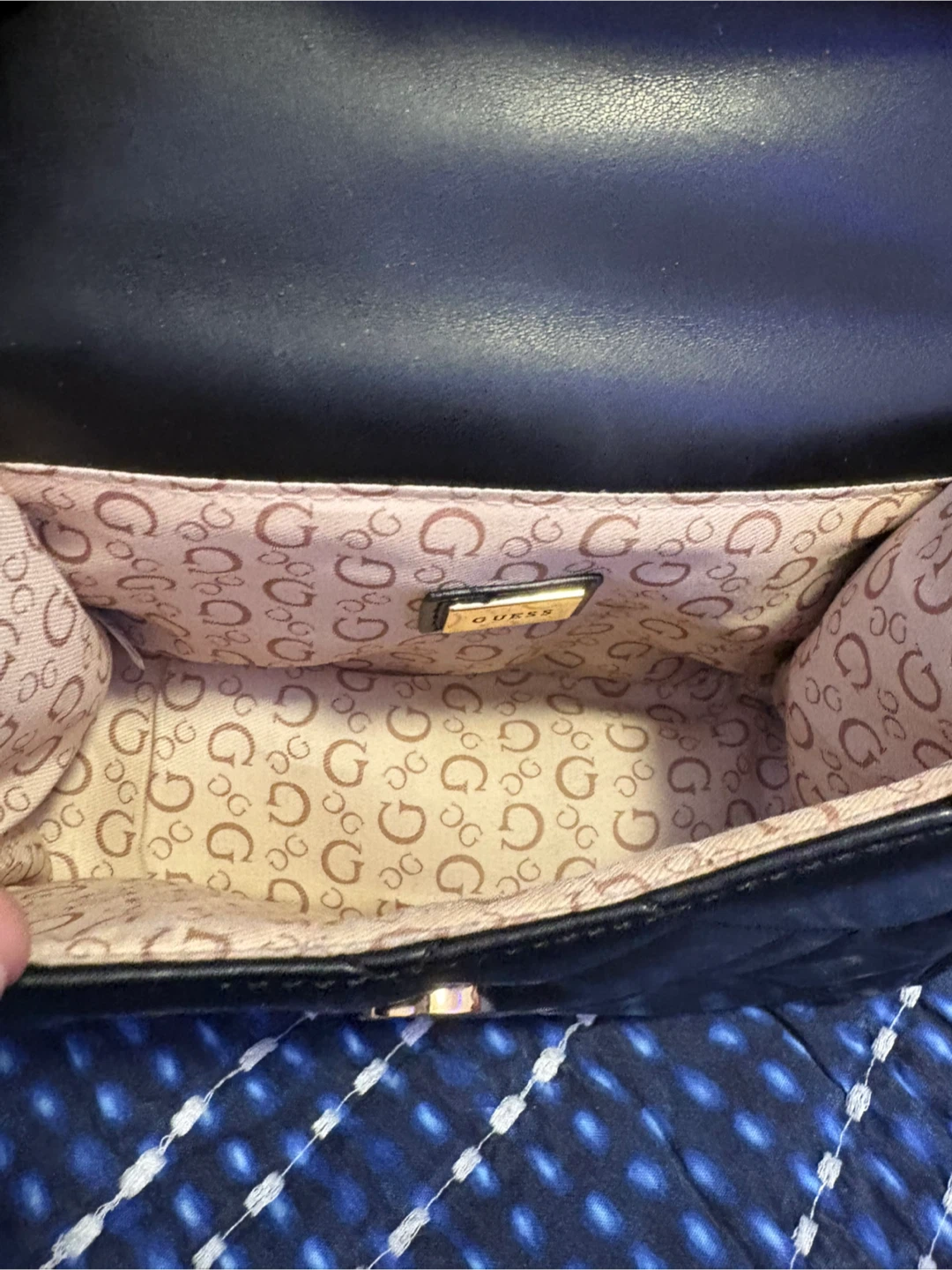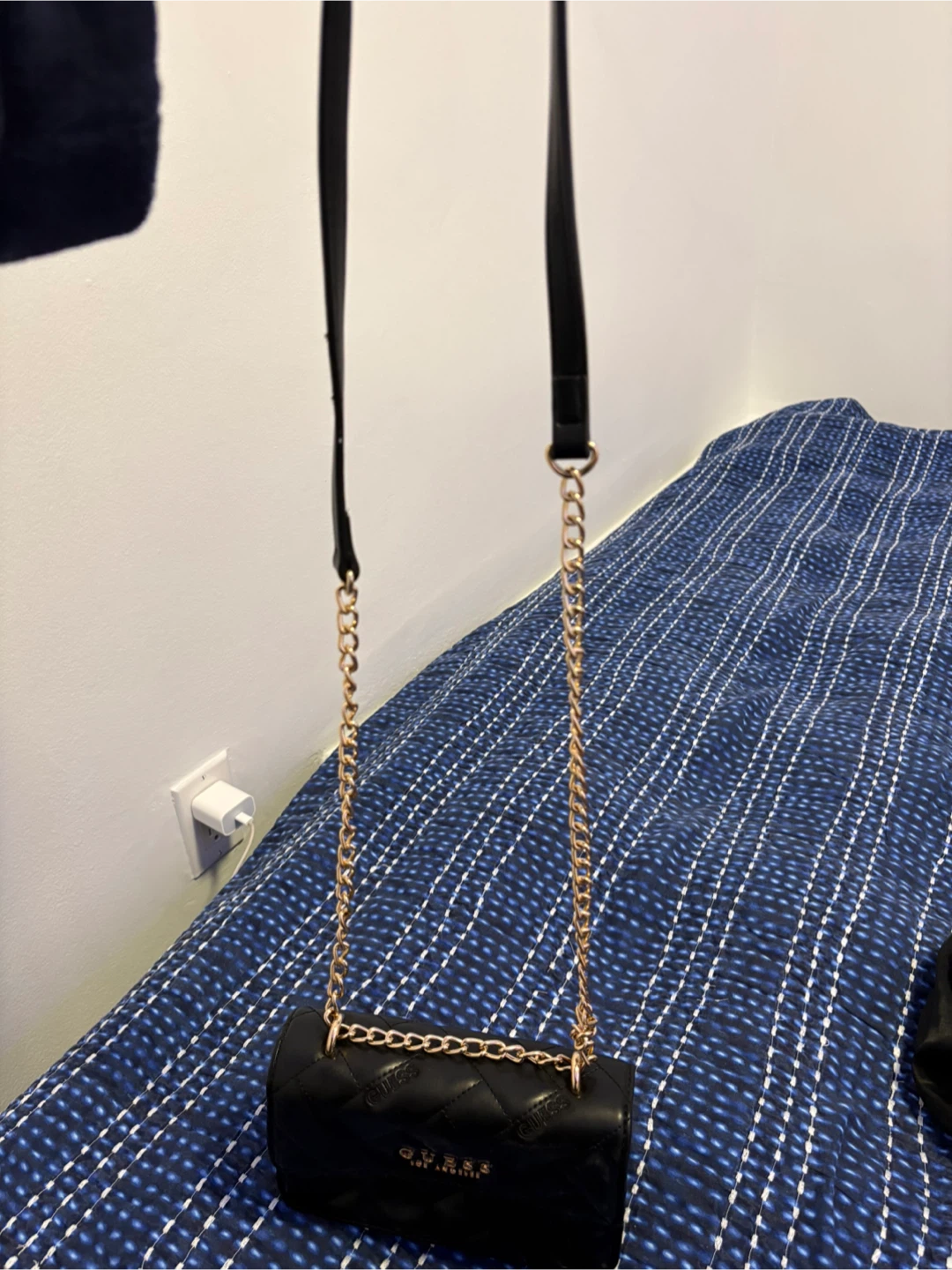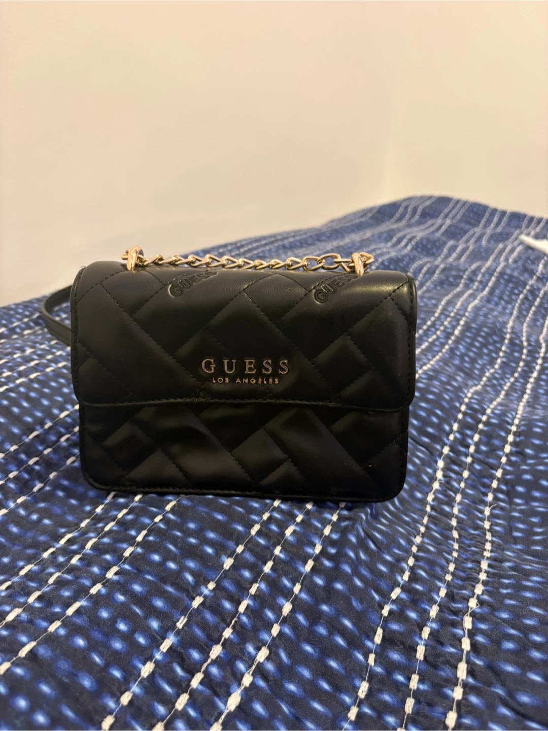 Black quilted crossbody bag from GUESS. Features a gold chain strap and signature lining. It's a compact size, perfect for essentials.