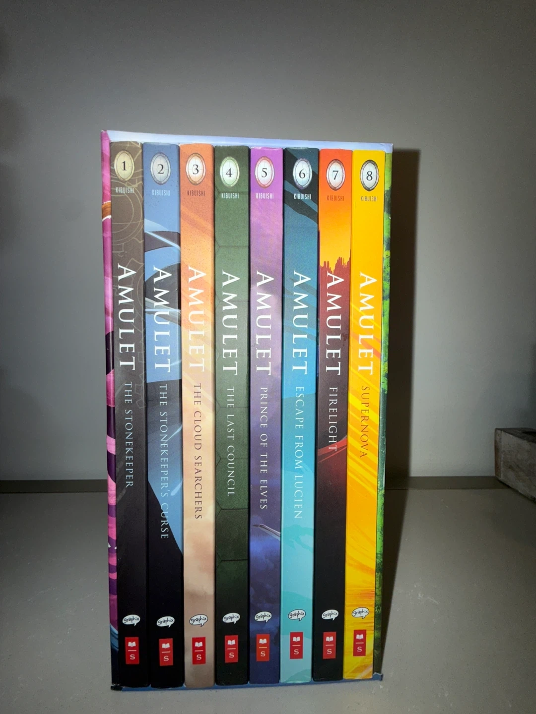 This is the complete Amulet eight-book collection by Kazu Kibuishi. It includes volumes 1 through 8 of the series. These graphic novels are a #1 New York Times bestselling series.