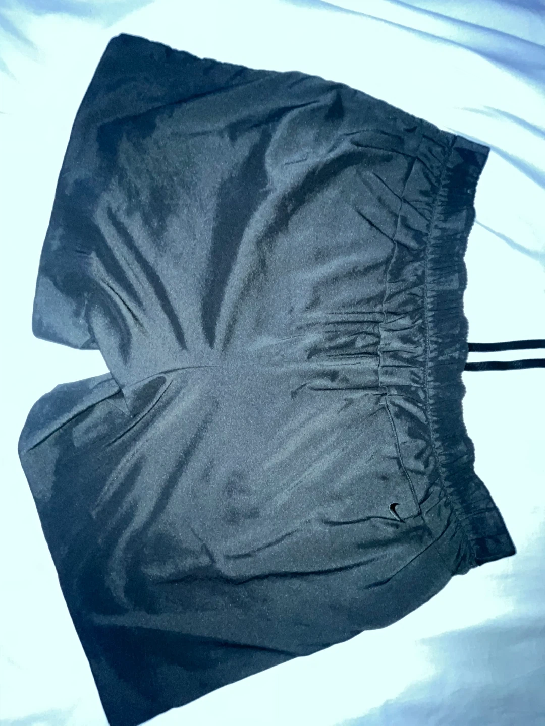 Nike black athletic shorts with a drawstring waist and elastic waistband. Features a small embroidered Nike swoosh logo on the back pocket.