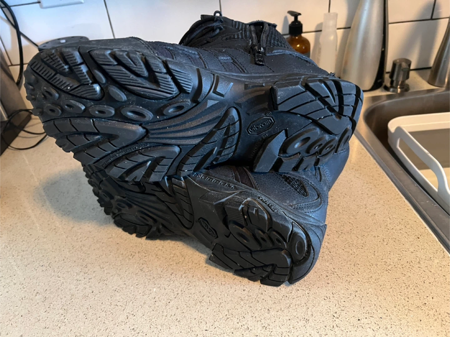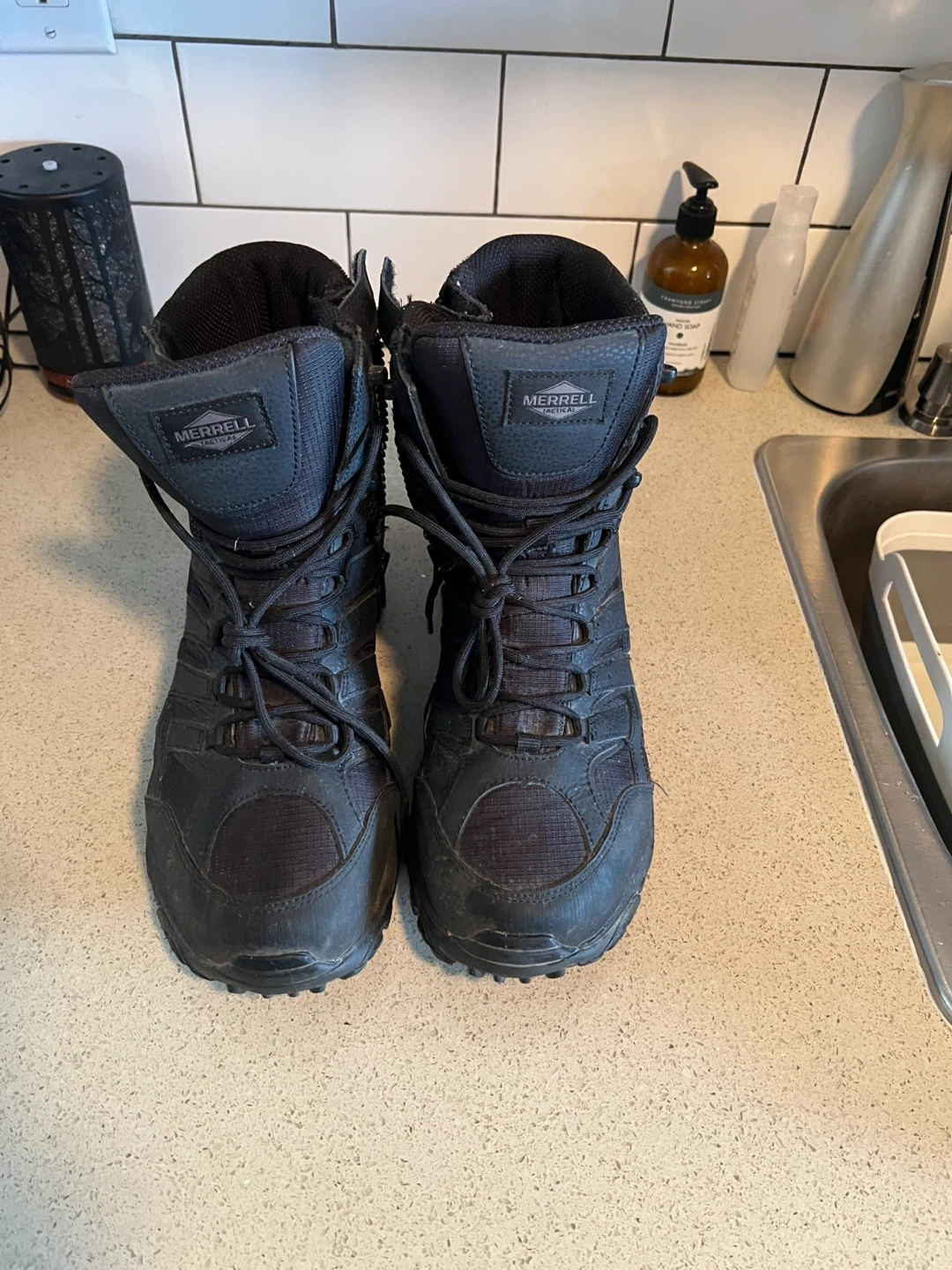 Merrell men's black winter tactical boots. These boots are size 11.5 W US They feature a side zipper/lace options and durable Vibram soles. Perfect for outdoor activities or work environments!
