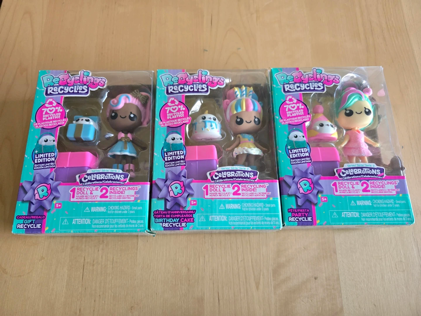 Selling a 3-pack of Recyclings Celebrations Series 3 dolls. Each doll is made with 70% recycled plastic and comes with a surprise recycling inside. Great for kids aged 5 and up!