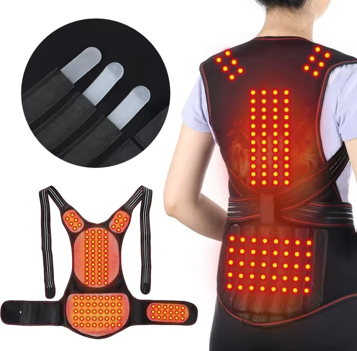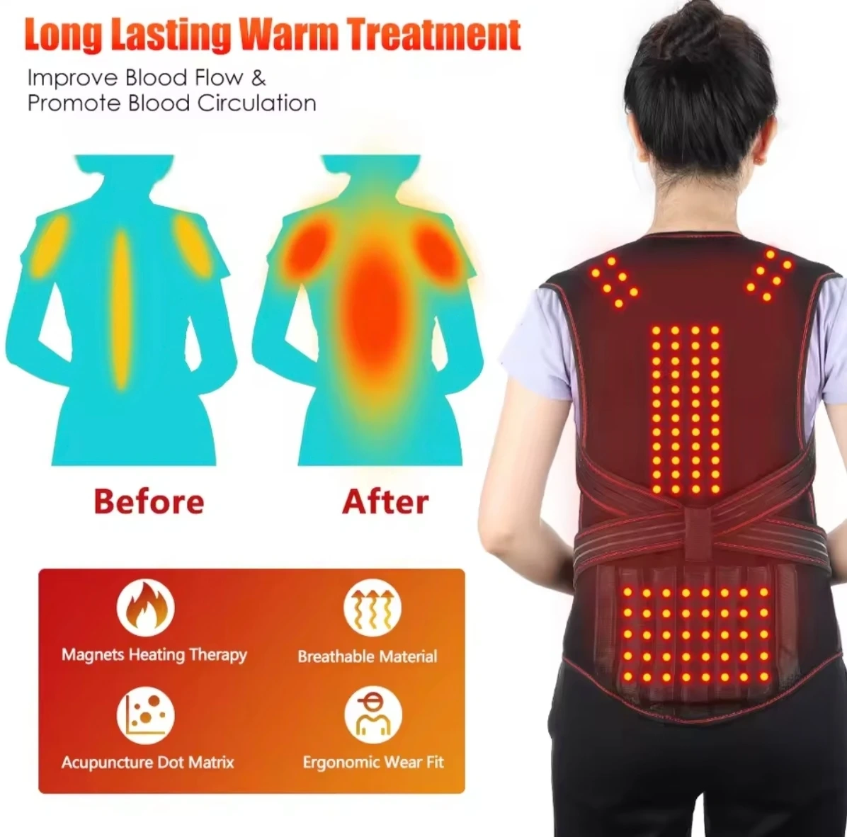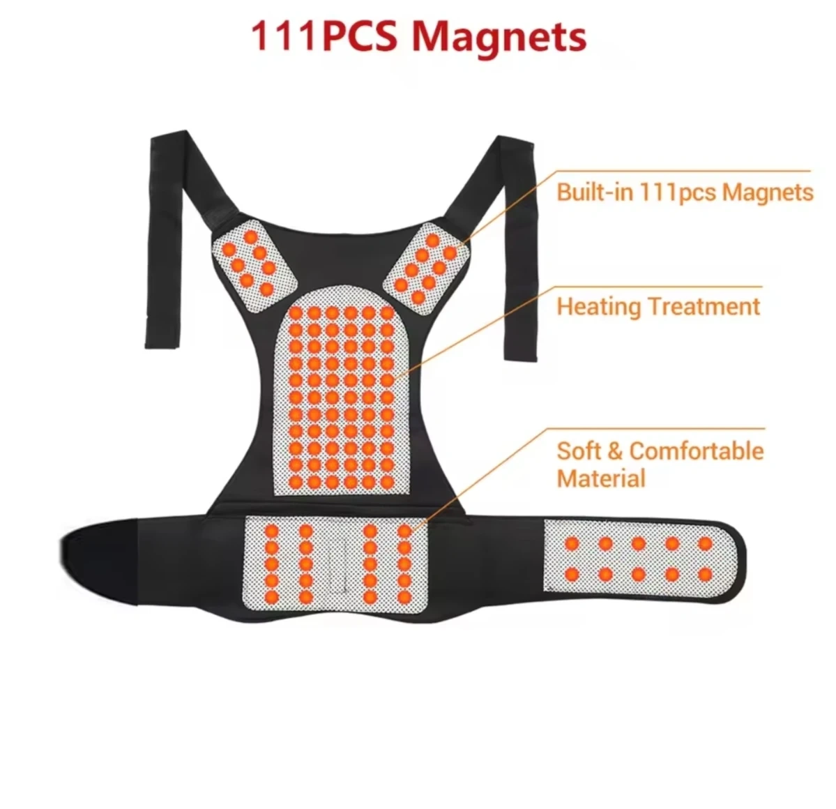 This back brace offers extensive heat therapy for your back. It's designed with breathable material and features an acupuncture dot matrix for long-lasting warm treatment. Built-in 111 magnets enhance the effect. It's soft and comfortable with an ergonomic wear fit.