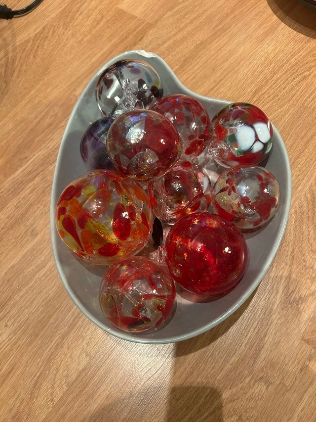 10 Beautiful, colourful, decorative hand blown glass balls, 1 medium and 9 small. Comes with a display dish that sits on three legs.