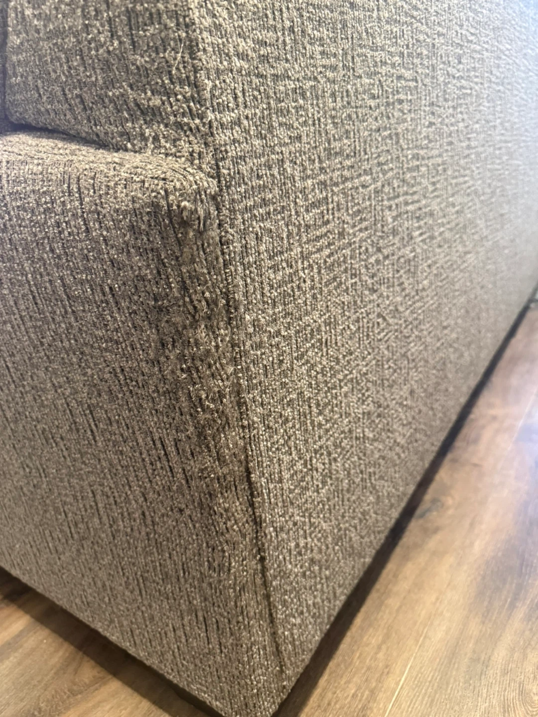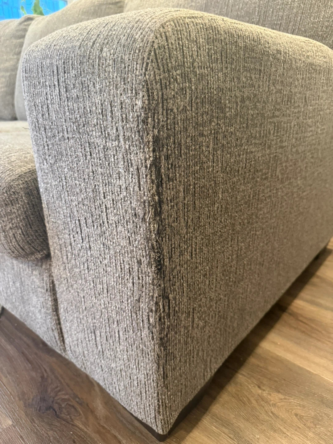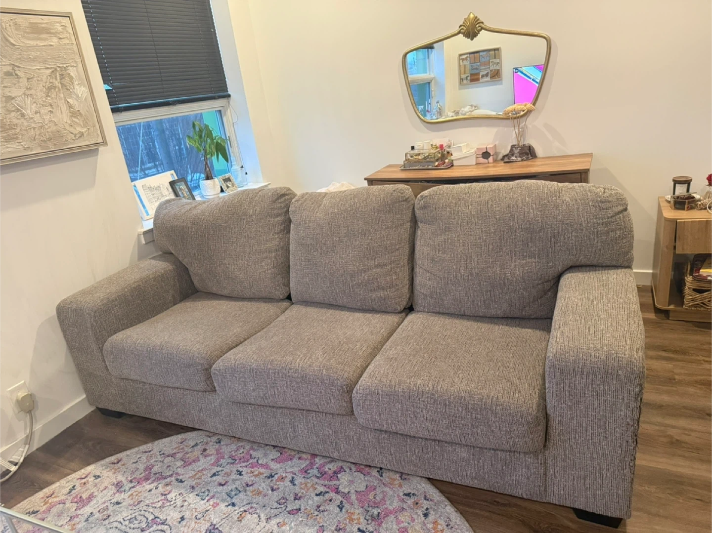 The most comfortable gray three-seater sofa. It's upholstered in a textured fabric— small signs of ware in left front and back corners as pictured. Elevator building but must be able to carry couch which requires 2 people or could pick it up around 10am morning of February 28th as scheduled movers can bring it outside