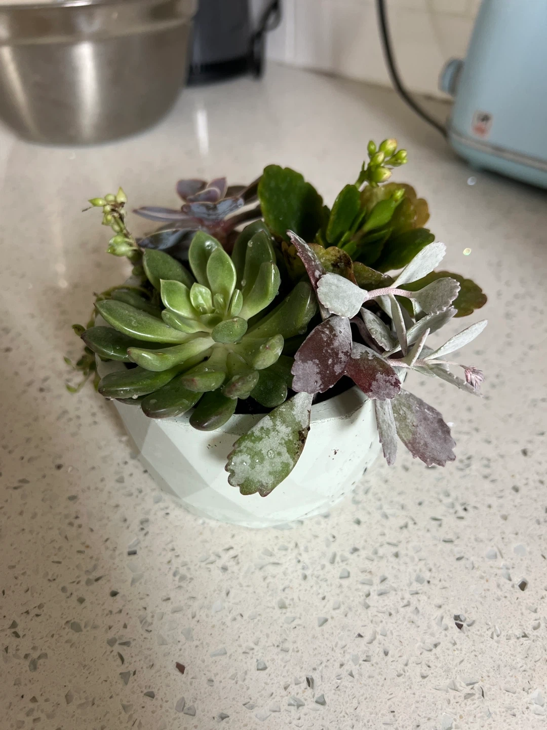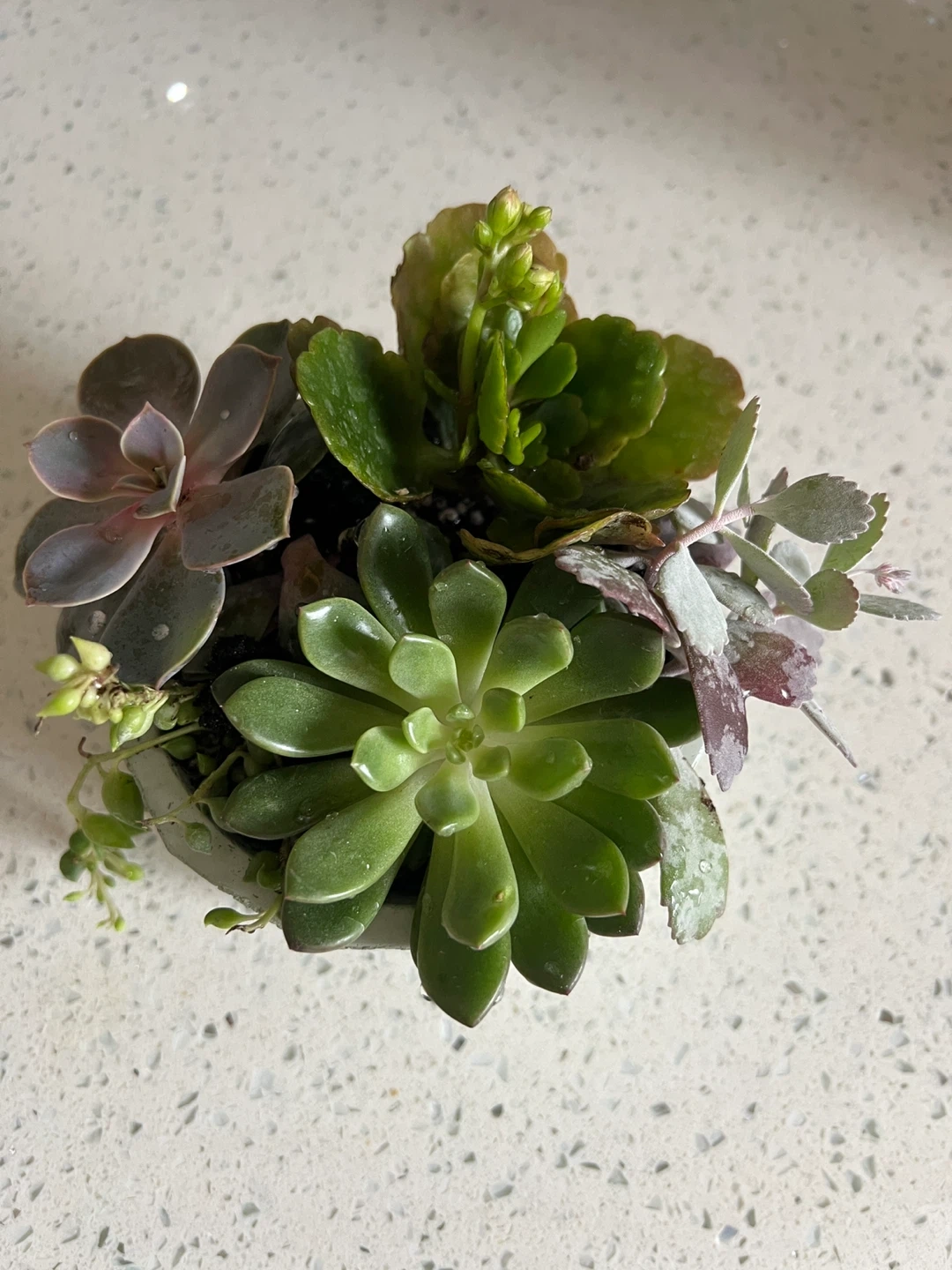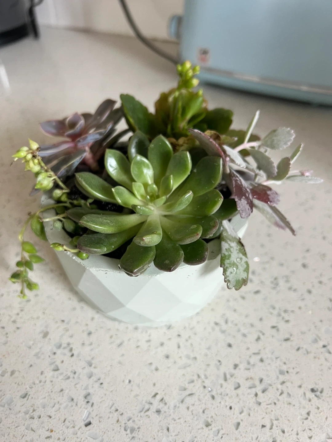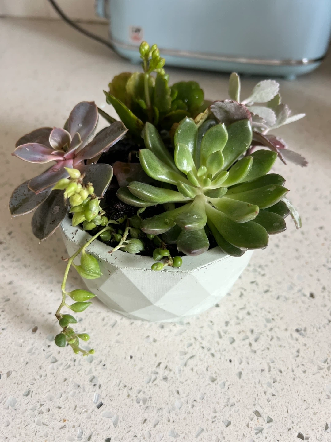 This is a small, decorative succulent arrangement. It features a variety of healthy plants in a light grey geometric pot. The pot is made of concrete. It's a great way to add a touch of green to your space!
