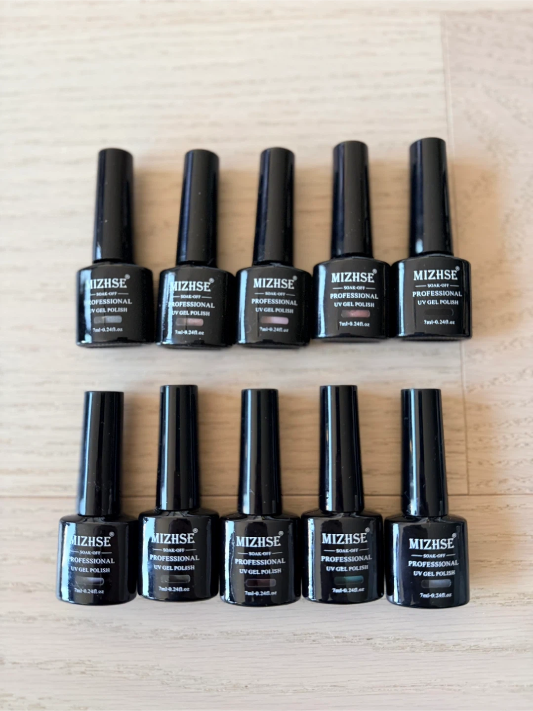 This set includes ten MIZHSE soak-off professional UV gel polish bottles. Each bottle contains 7ml (0.24fl.oz) of polish. These are designed for professional use in UV gel manicures. They offer a long-lasting, chip-resistant finish when applied with a UV lamp. A great collection for any nail technician or enthusiast!