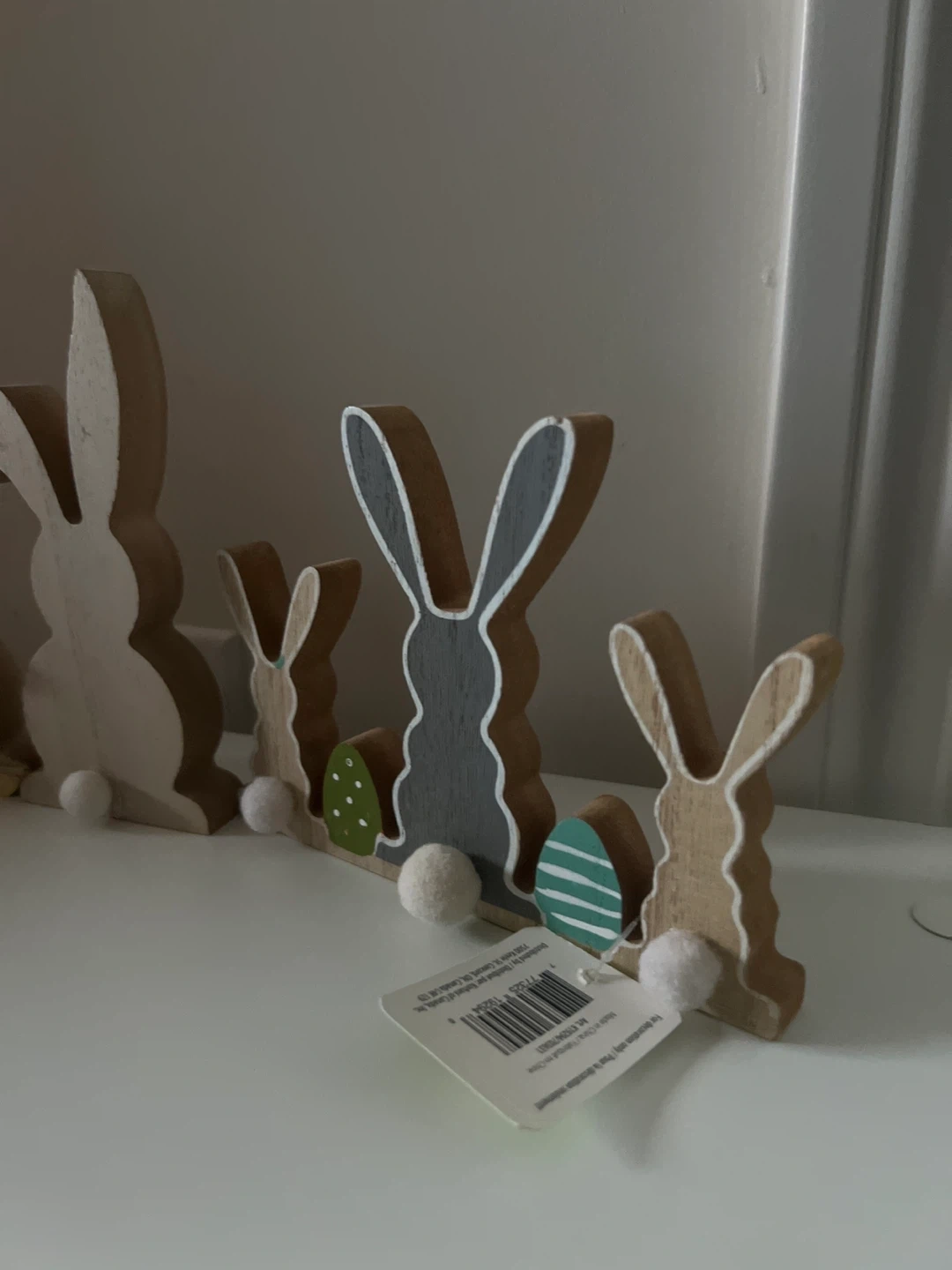 This set includes several wooden bunnies and Easter eggs, perfect for seasonal decor. It's made of wood with some painted details and small fuzzy pom-poms. Adds a cute touch to any home for spring celebrations!