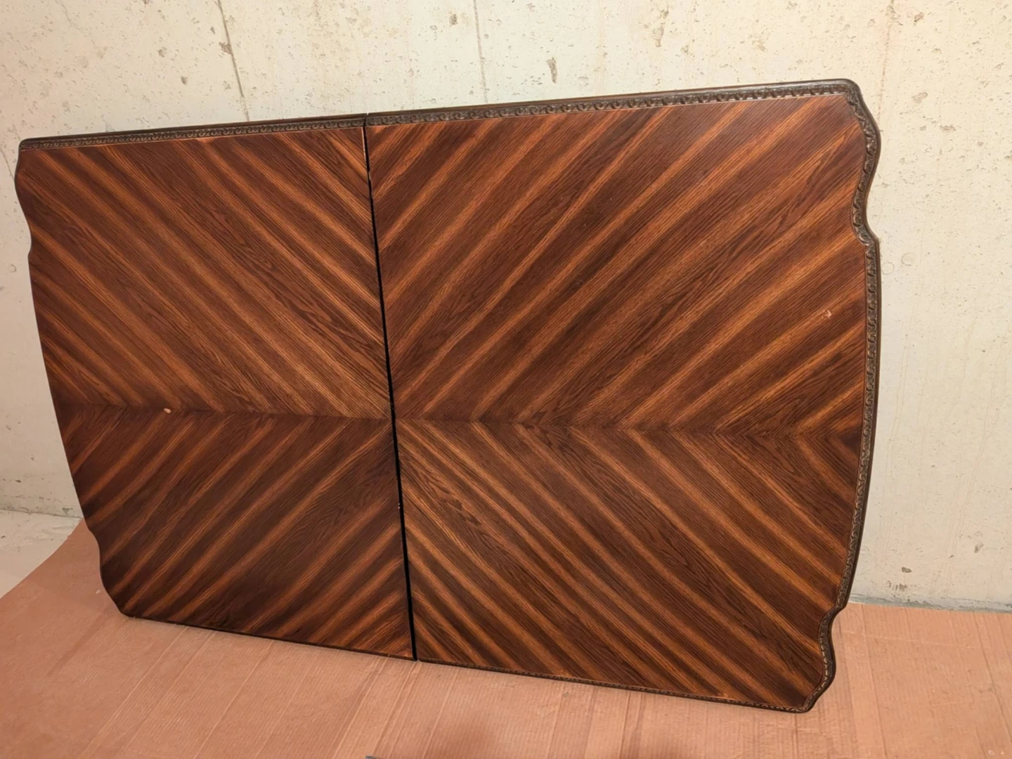 This is a vintage wood table top panel. It features a beautiful chevron wood grain pattern. The edges are finished with a decorative metal border. Its shape is rectangular with curved ends.