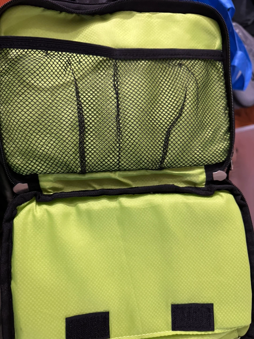 This is a black organizer pouch designed for electronics accessories. It features multiple elastic straps and mesh pockets inside to keep cables, chargers, and small devices neatly stored. The compact size makes it easy to carry.