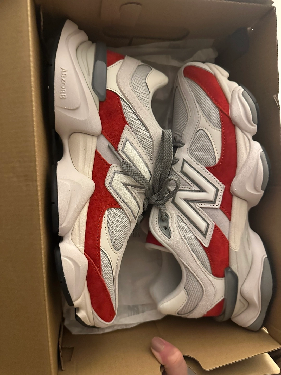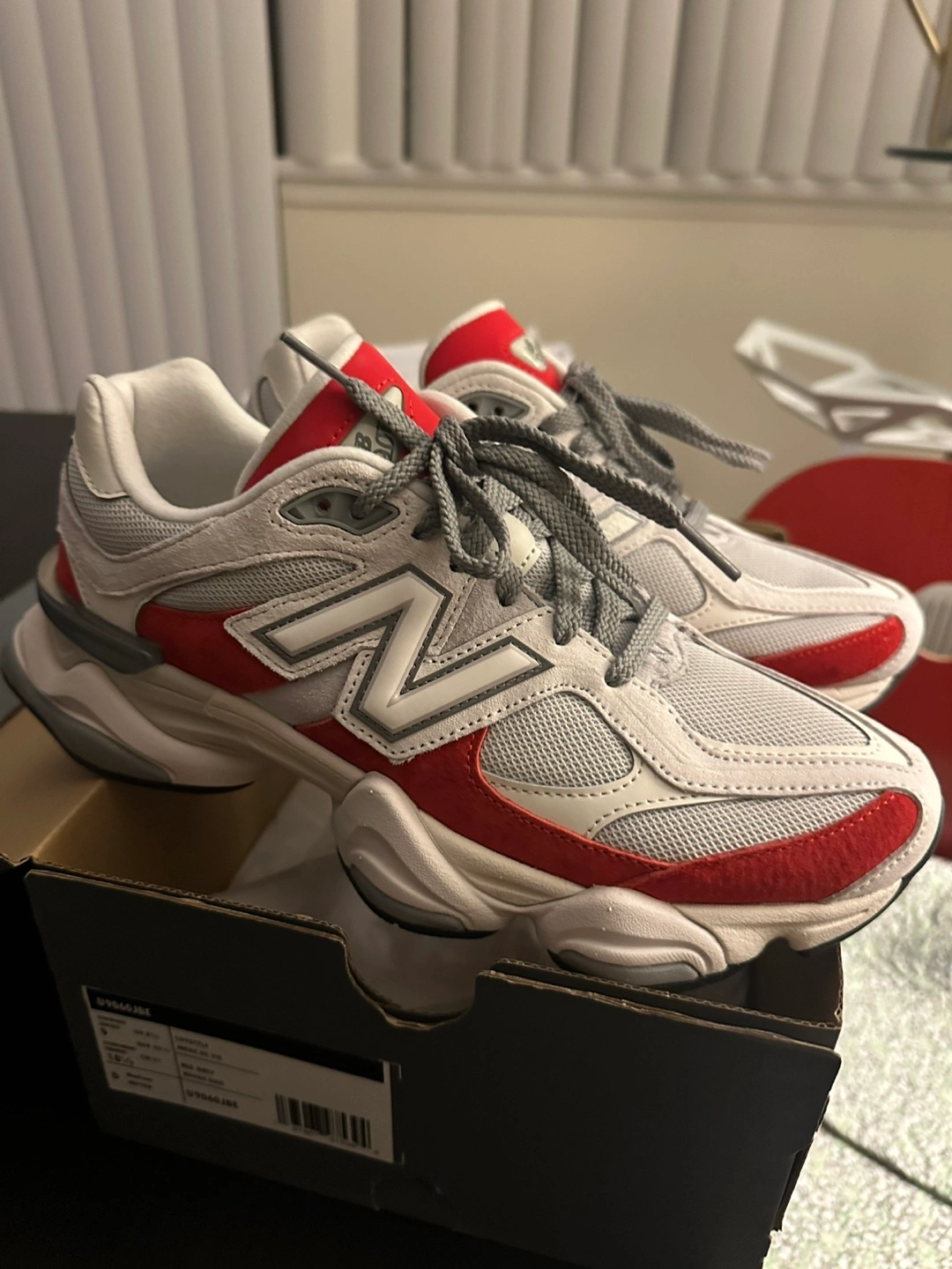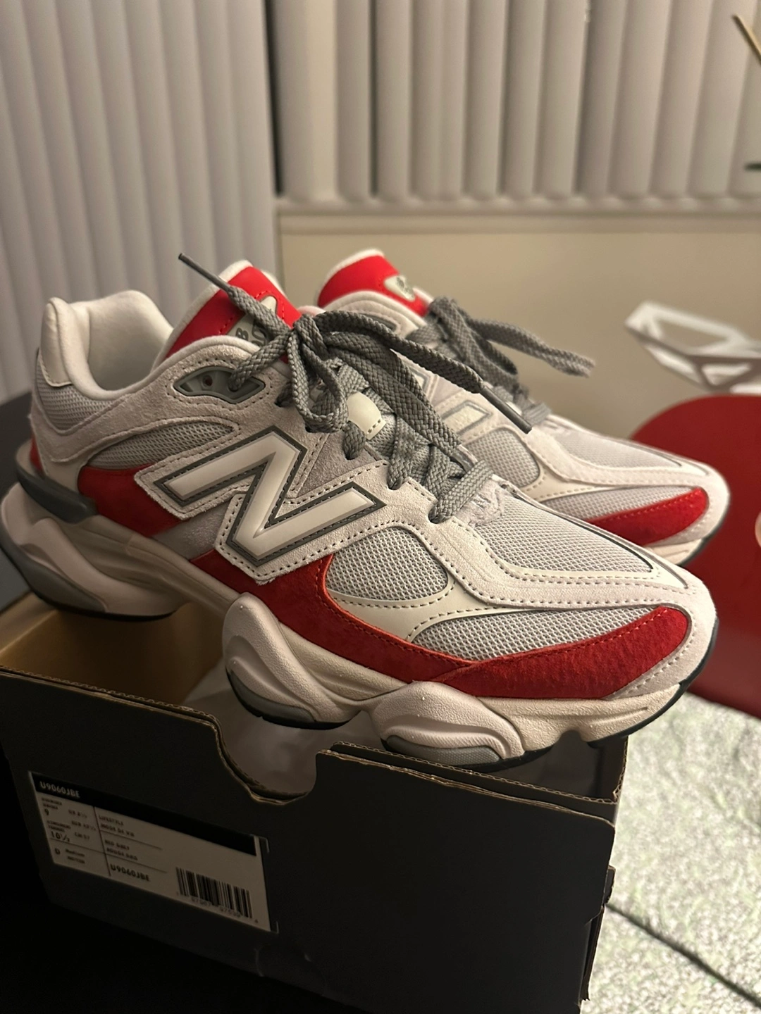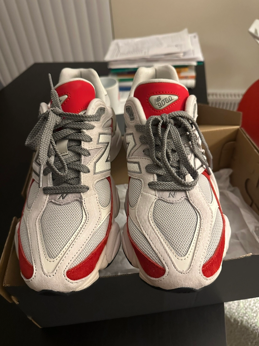 Selling a pair of New Balance 9060 sneakers in a red and grey colourway. They come with the original box. Great condition!