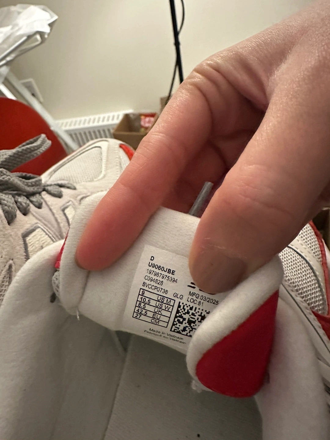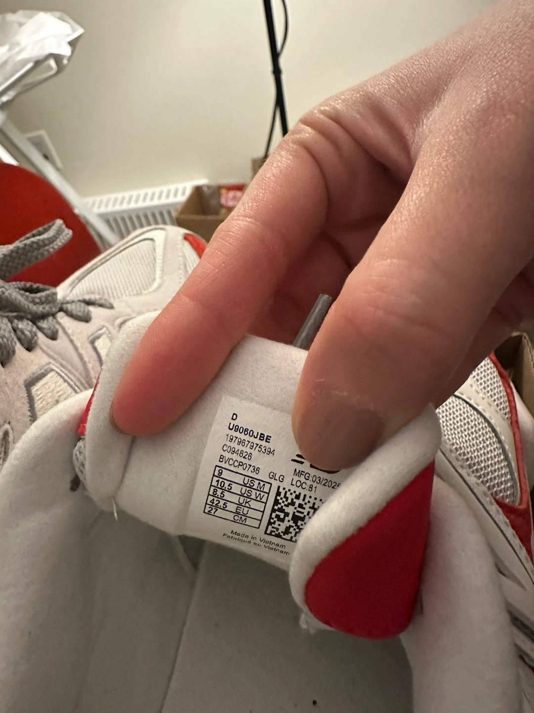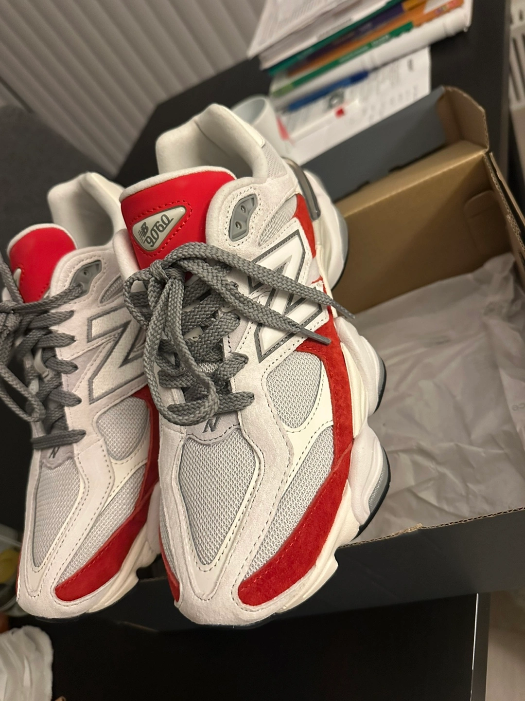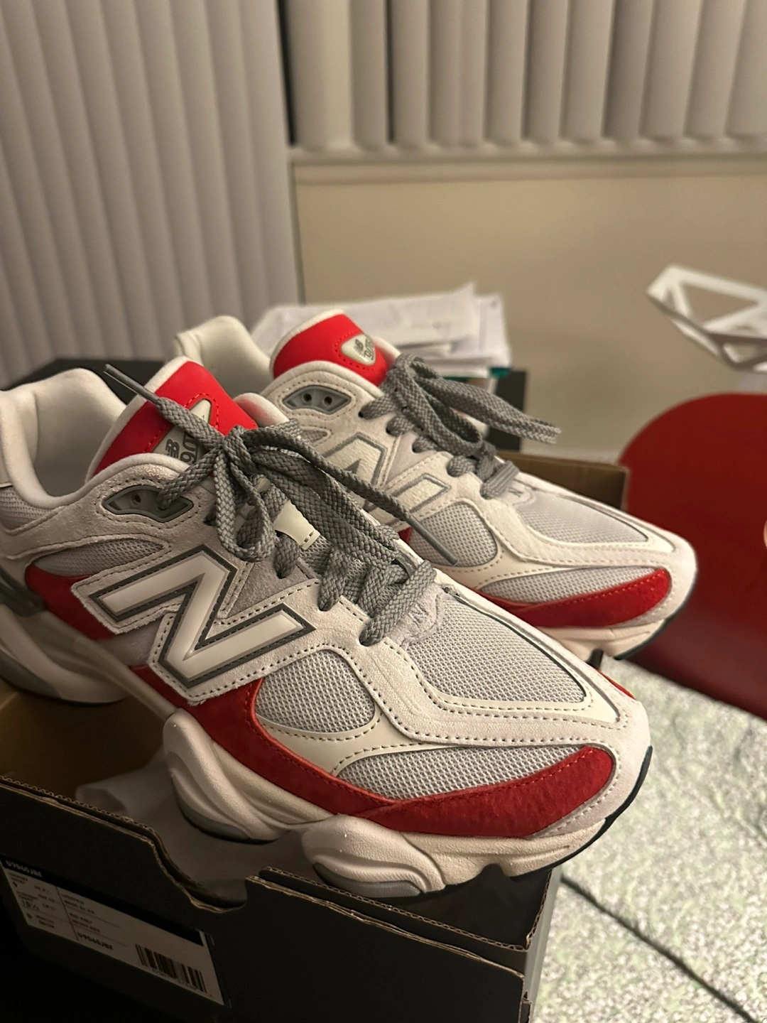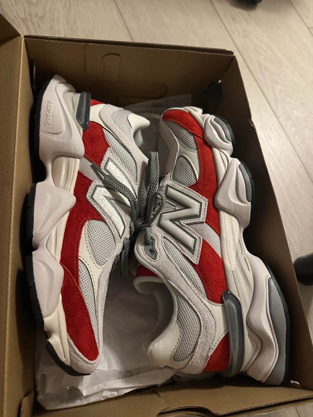 Selling a pair of New Balance 9060 sneakers in a red and grey colourway. They come with the original box. Great condition!