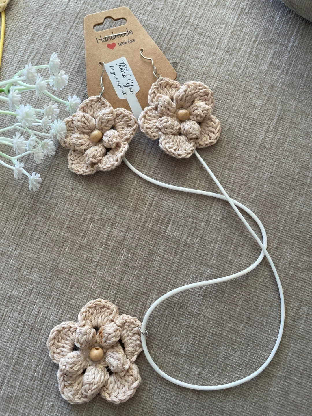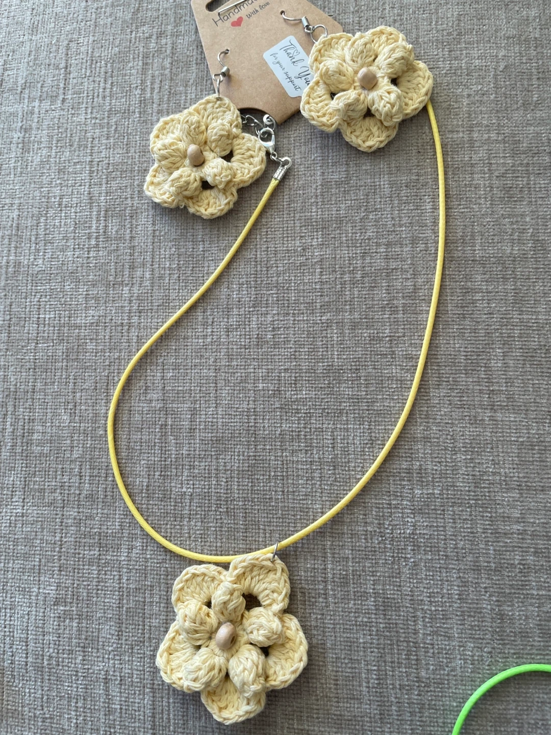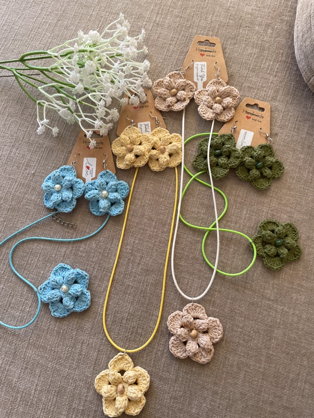 A set of handmade crochet flower earrings and a matching necklace. Available in beige, green, yellow, and blue.