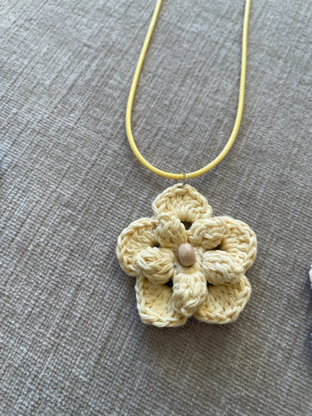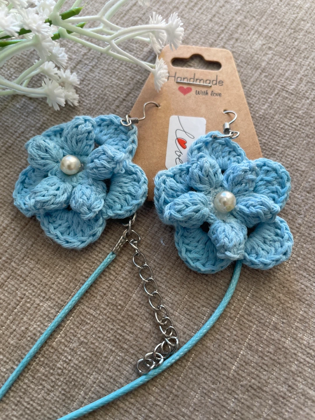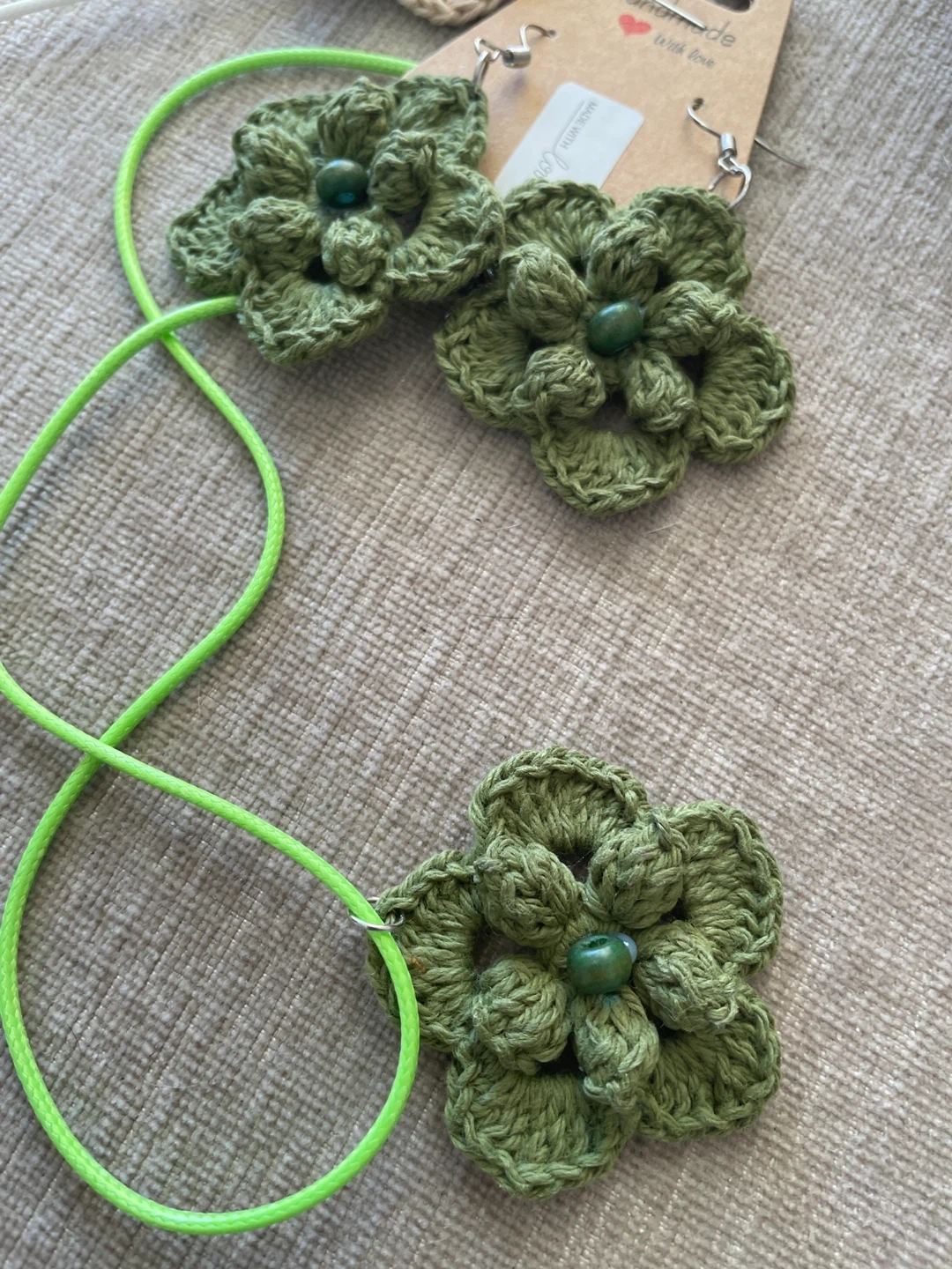 A set of handmade crochet flower earrings and a matching necklace. Available in beige, green, yellow, and blue.
