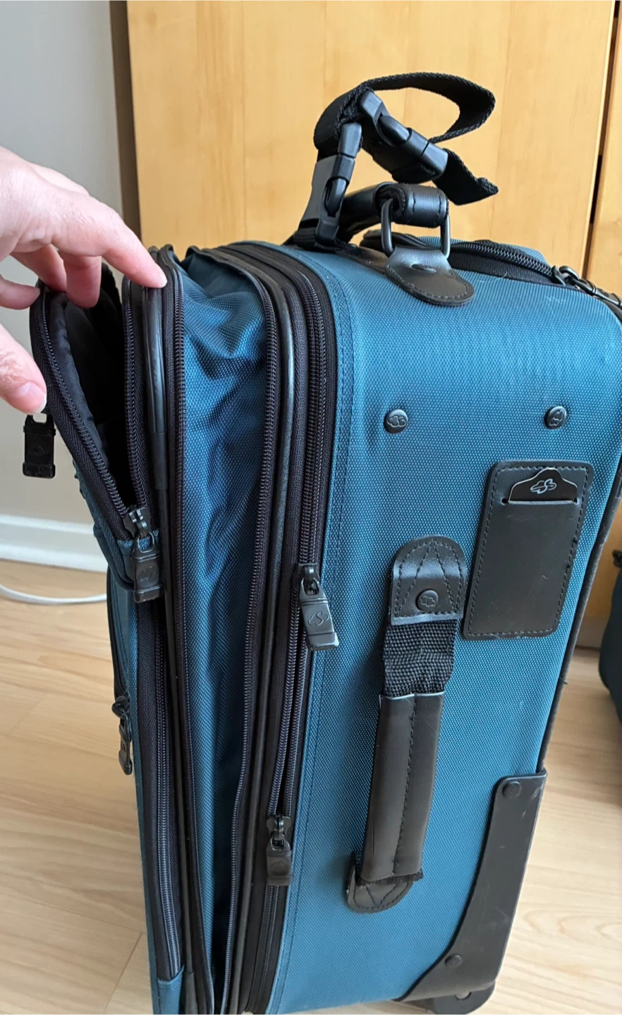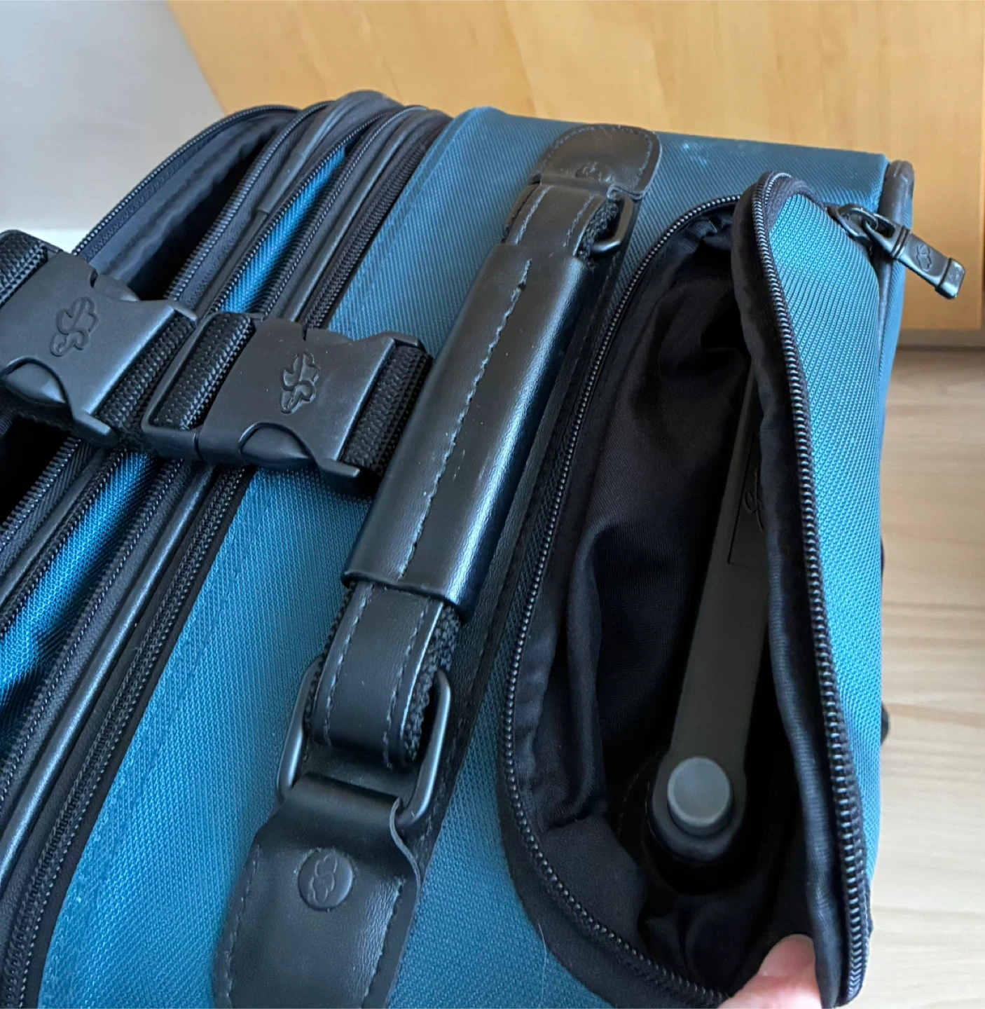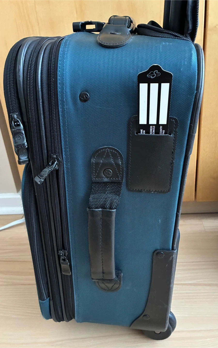 - carry-on has two handles, shoulder strap and a pull thru trolley strap