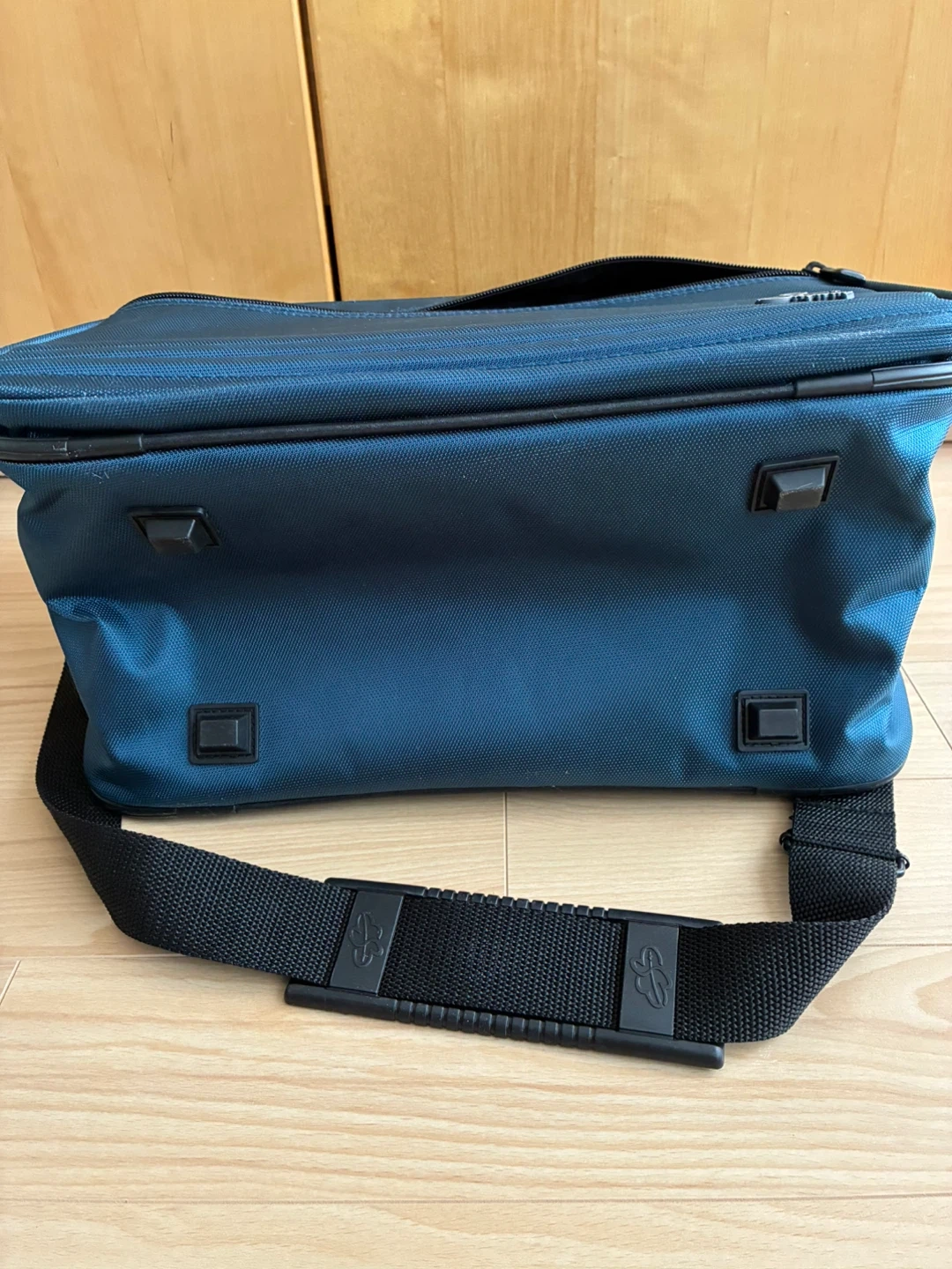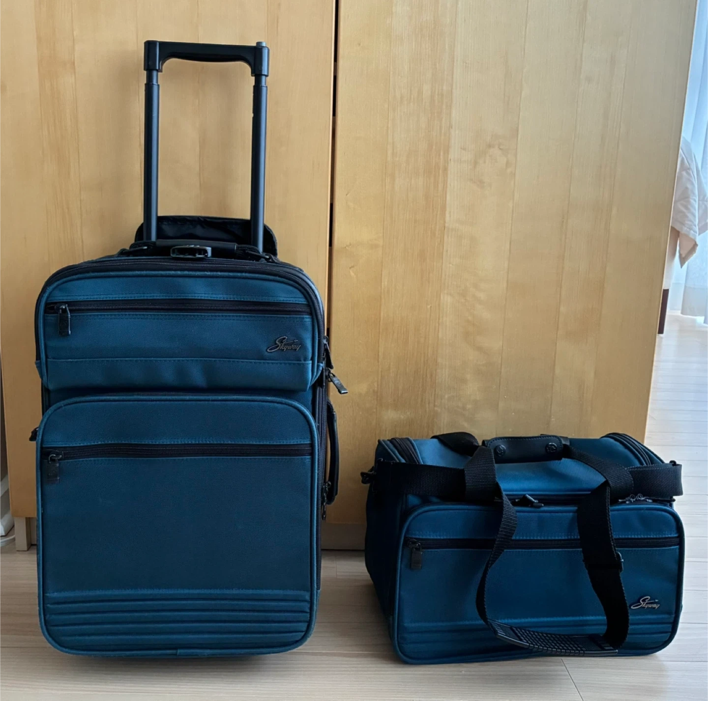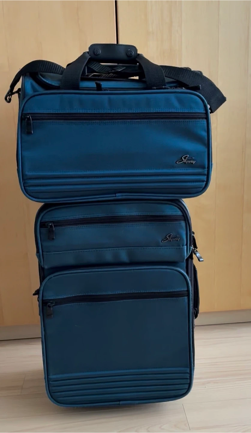 - carry-on has two handles, shoulder strap and a pull thru trolley strap