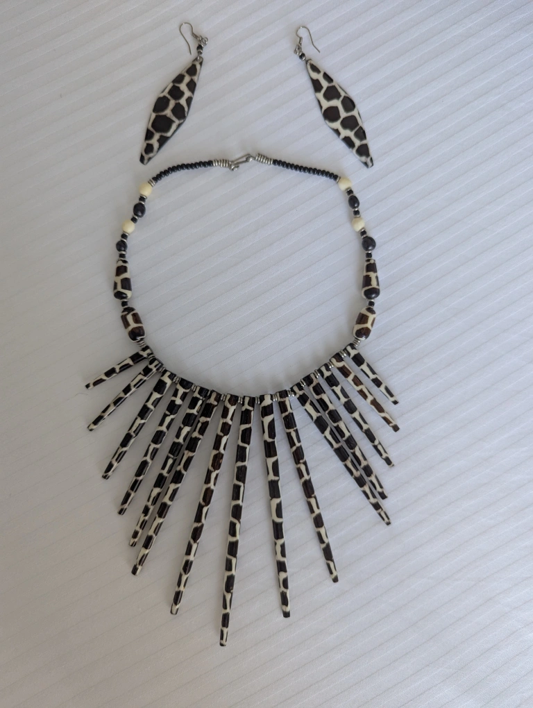 Beautiful necklace and earring set. Features a unique giraffe print design. Necklace has a beaded chain and a striking, radiating pendant. Matching earrings are included.