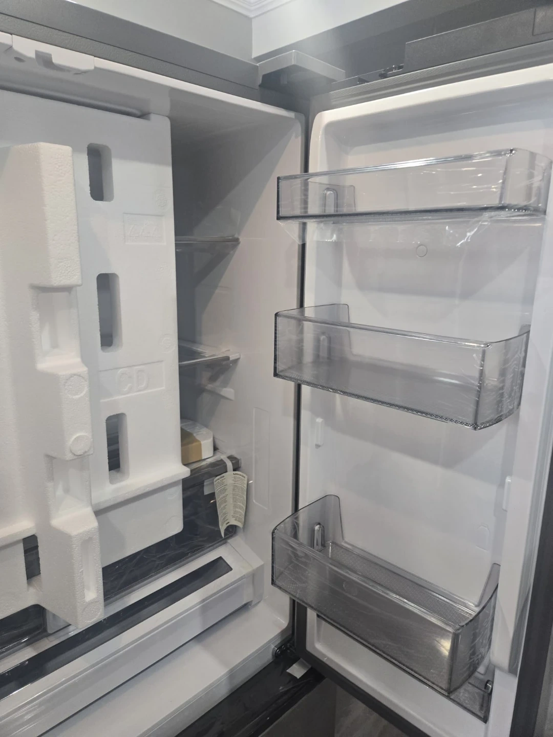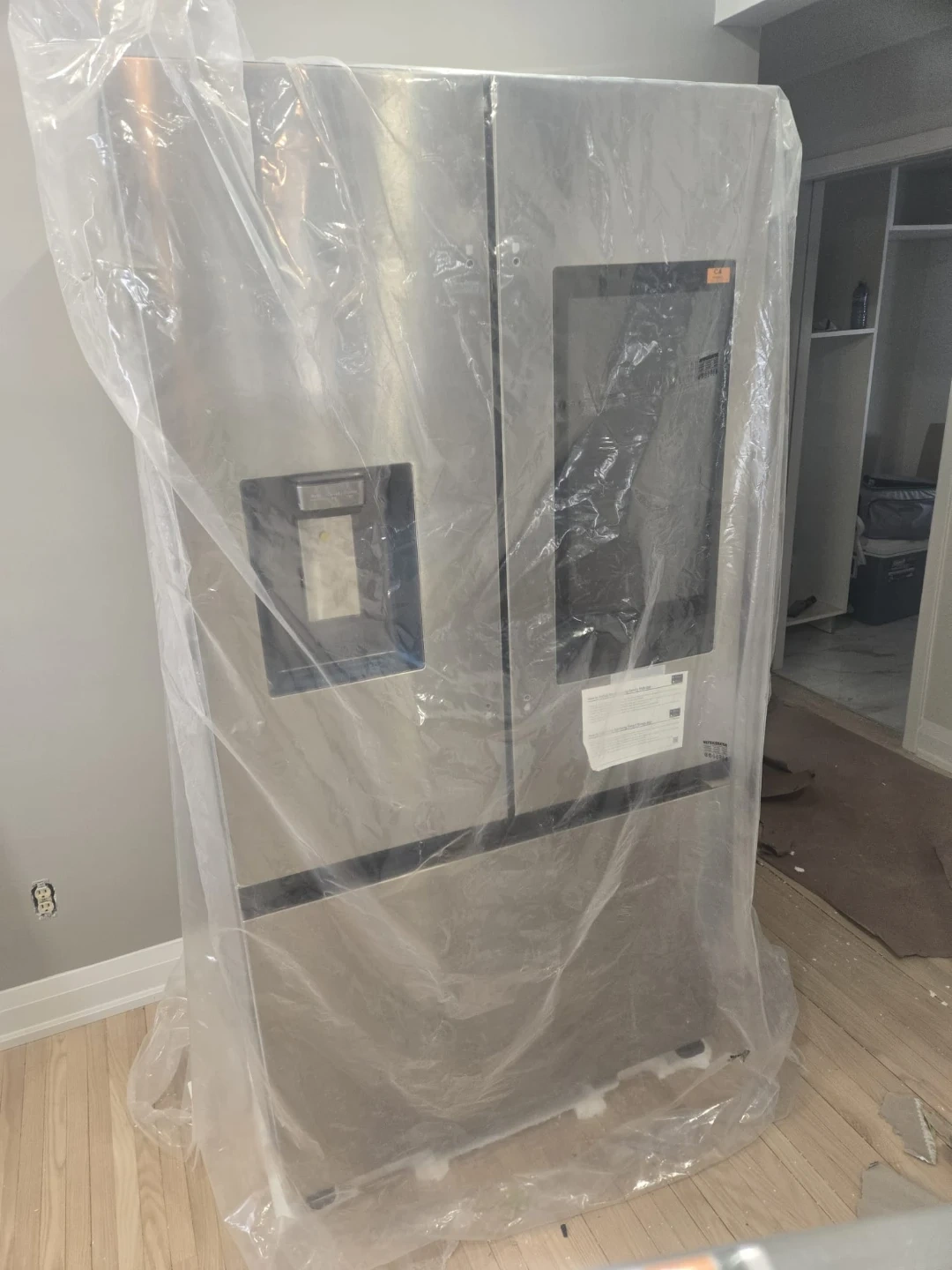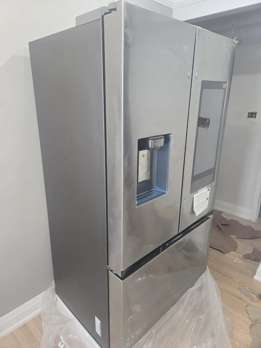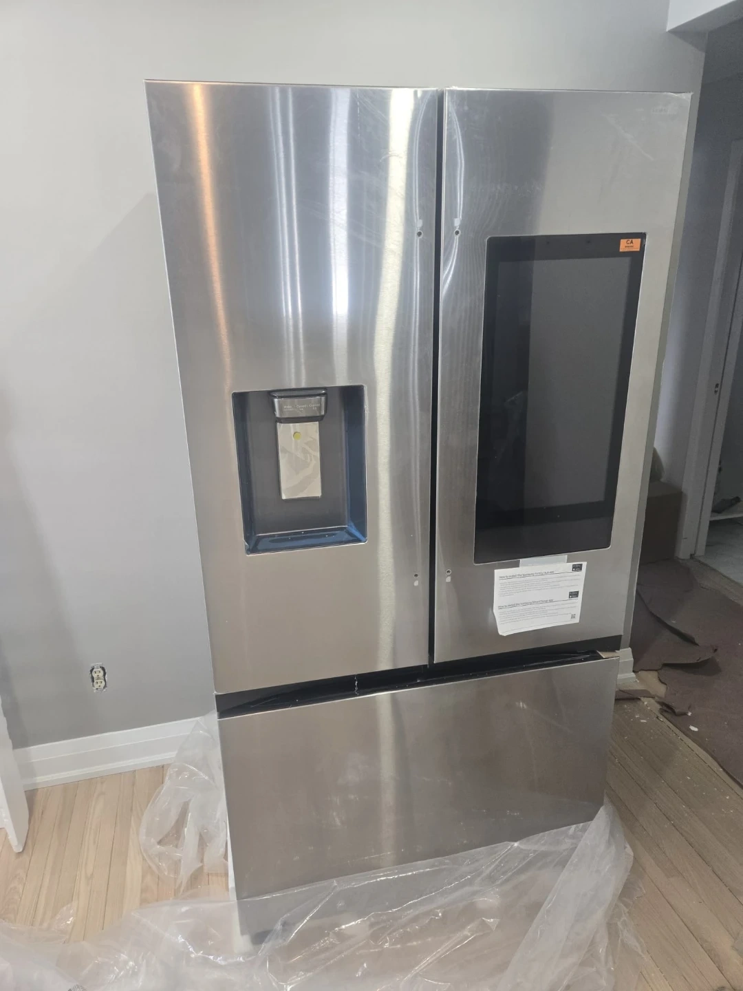 This Samsung InstaView refrigerator with an ice and water dispenser, refrigerator is brand new and still has its protective plastic covering on. It has a handy door-in-door compartment and a sleek stainless steel finish. You can see inside without opening the door thanks to the InstaView panel, which saves energy!
