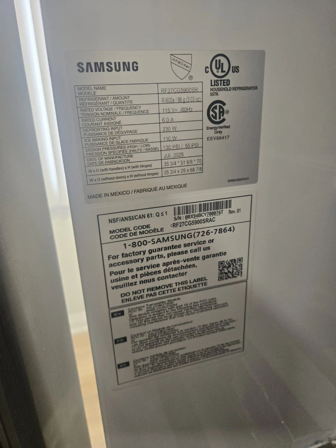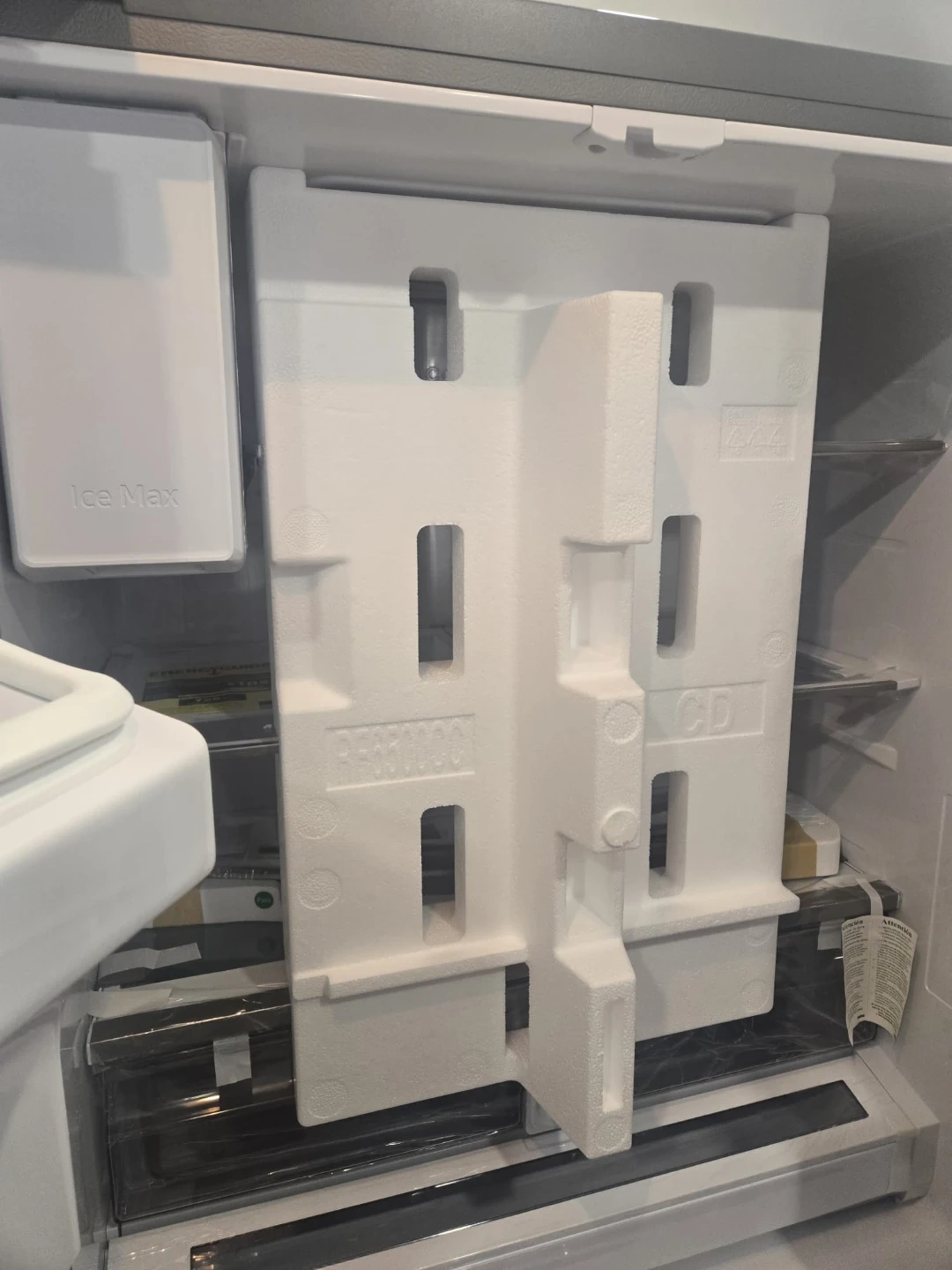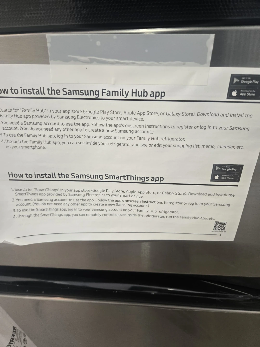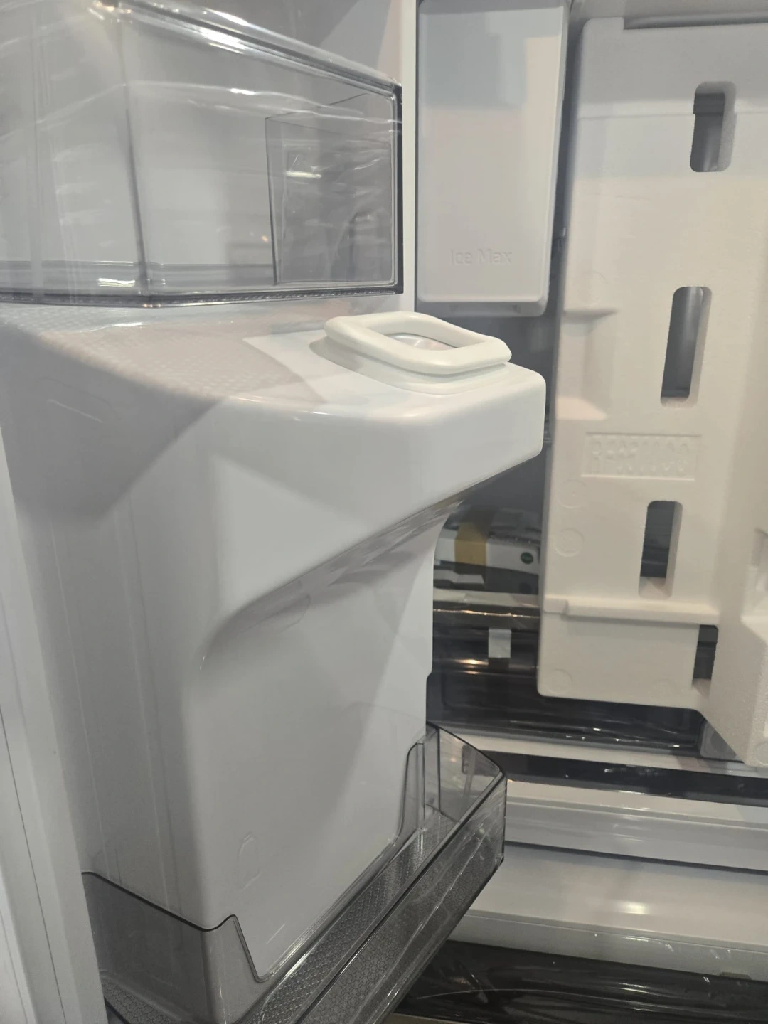 This Samsung InstaView refrigerator with an ice and water dispenser, refrigerator is brand new and still has its protective plastic covering on. It has a handy door-in-door compartment and a sleek stainless steel finish. You can see inside without opening the door thanks to the InstaView panel, which saves energy!