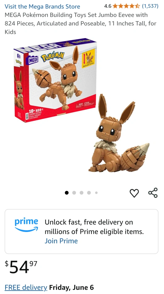 - Jumbo Eevee with 824 Pieces (11 Inches Tall) for $30