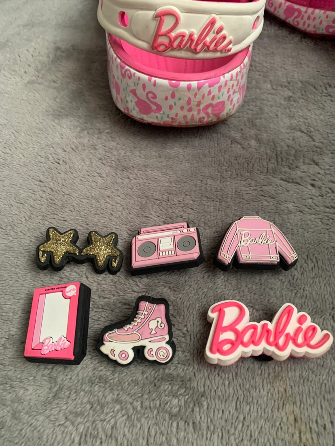 Bright pink Barbie Crocs! Barbie graphics and come with a set of 6 charms, including stars, a boombox, a jacket, a roller skate, and a Barbie logo. Perfect for little ones who love to play and show off their style!