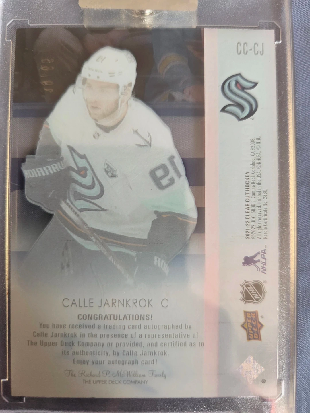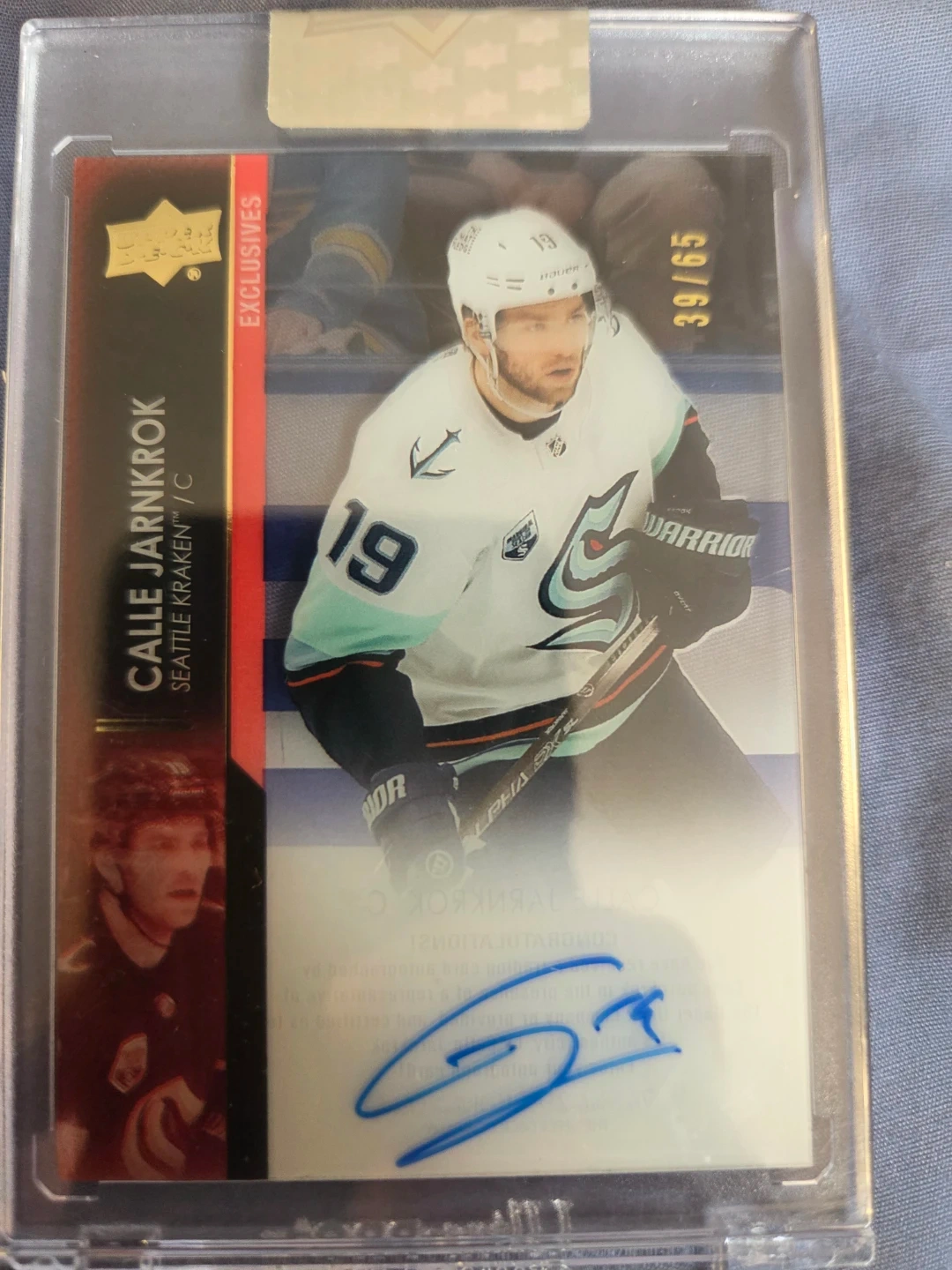 This is a 2021-22 Upper Deck hockey card featuring Calle Jarnkrok. It's an autographed exclusive card, numbered 39 of 65.card has been certified by Upper Deck Company.