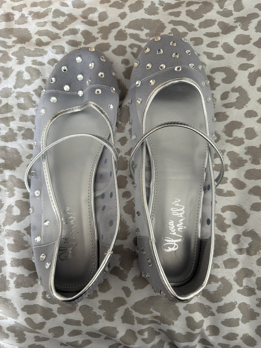These adorable Olivia Miller girl's shoes are perfect for any dressy occasion! They are a beautiful silver color and feature sparkling rhinestones. They are in great condition and ready for a new owner!