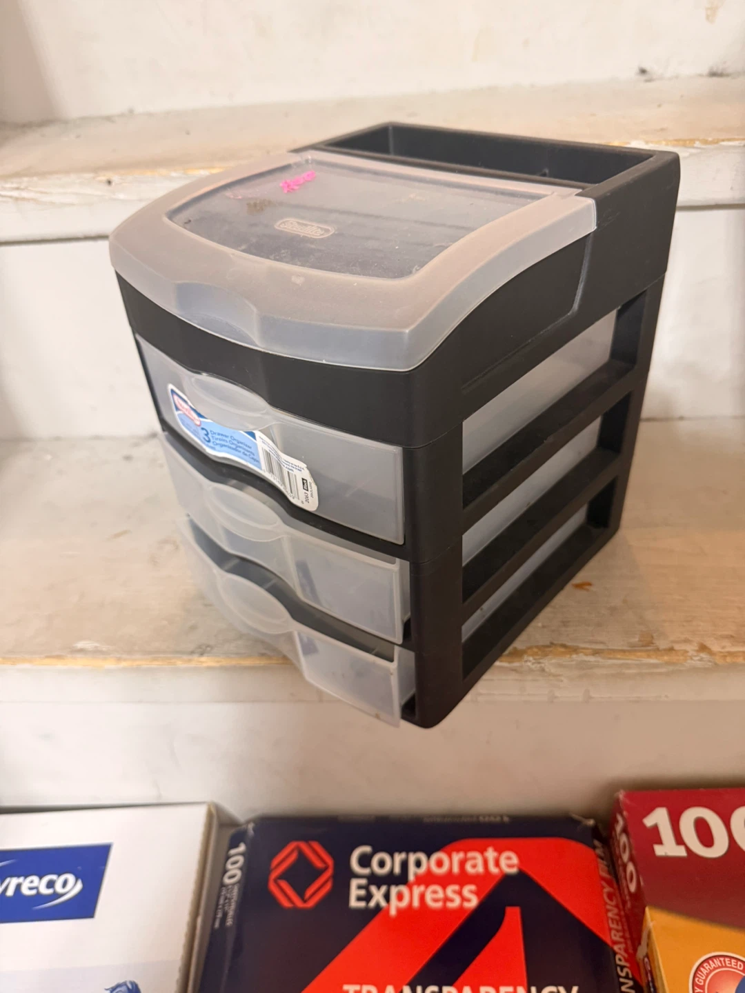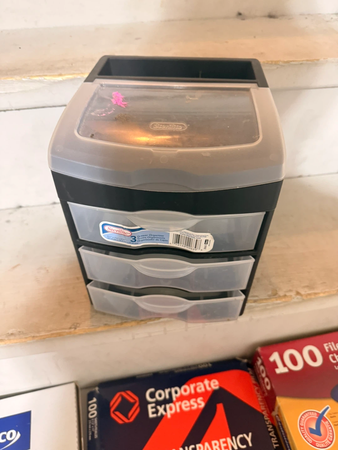 This Sterilite organizer unit comes with three clear drawers. It's great for storing small craft supplies or office essentials. The top compartment offers extra space for items you need handy.