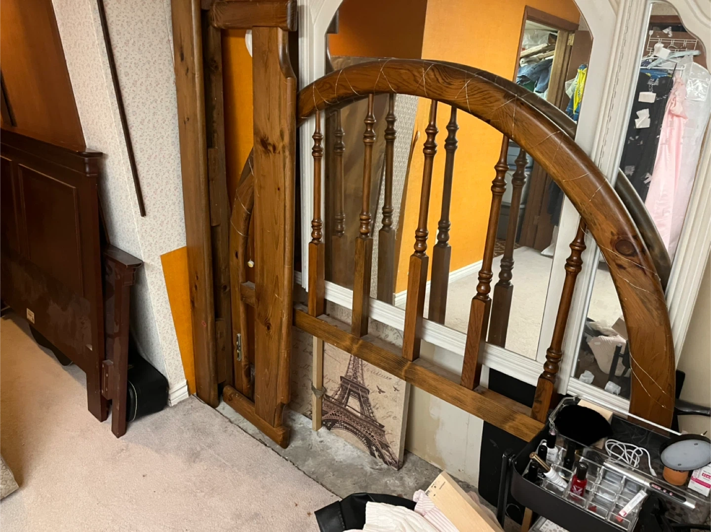 Solid wood bed frame components, including a headboard and footboard. The headboard features a curved design with turned spindles. Wood construction offers durability.