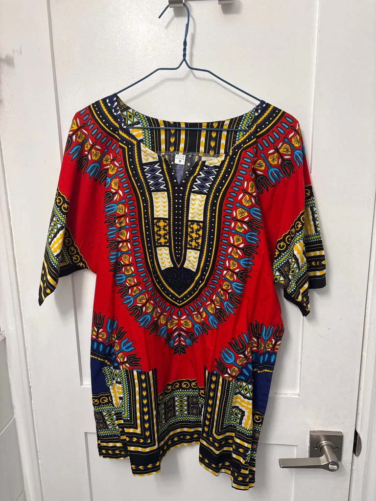 Selling a vibrant dashiki top in size medium! It features a colourful and unique design, perfect for adding a pop of culture to your wardrobe. In great condition!