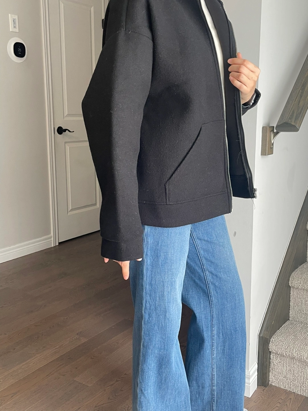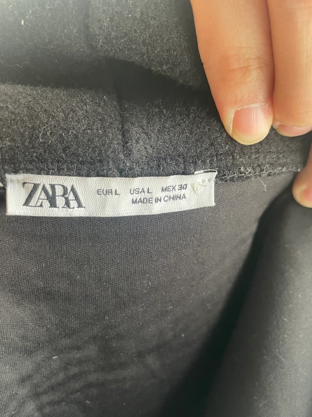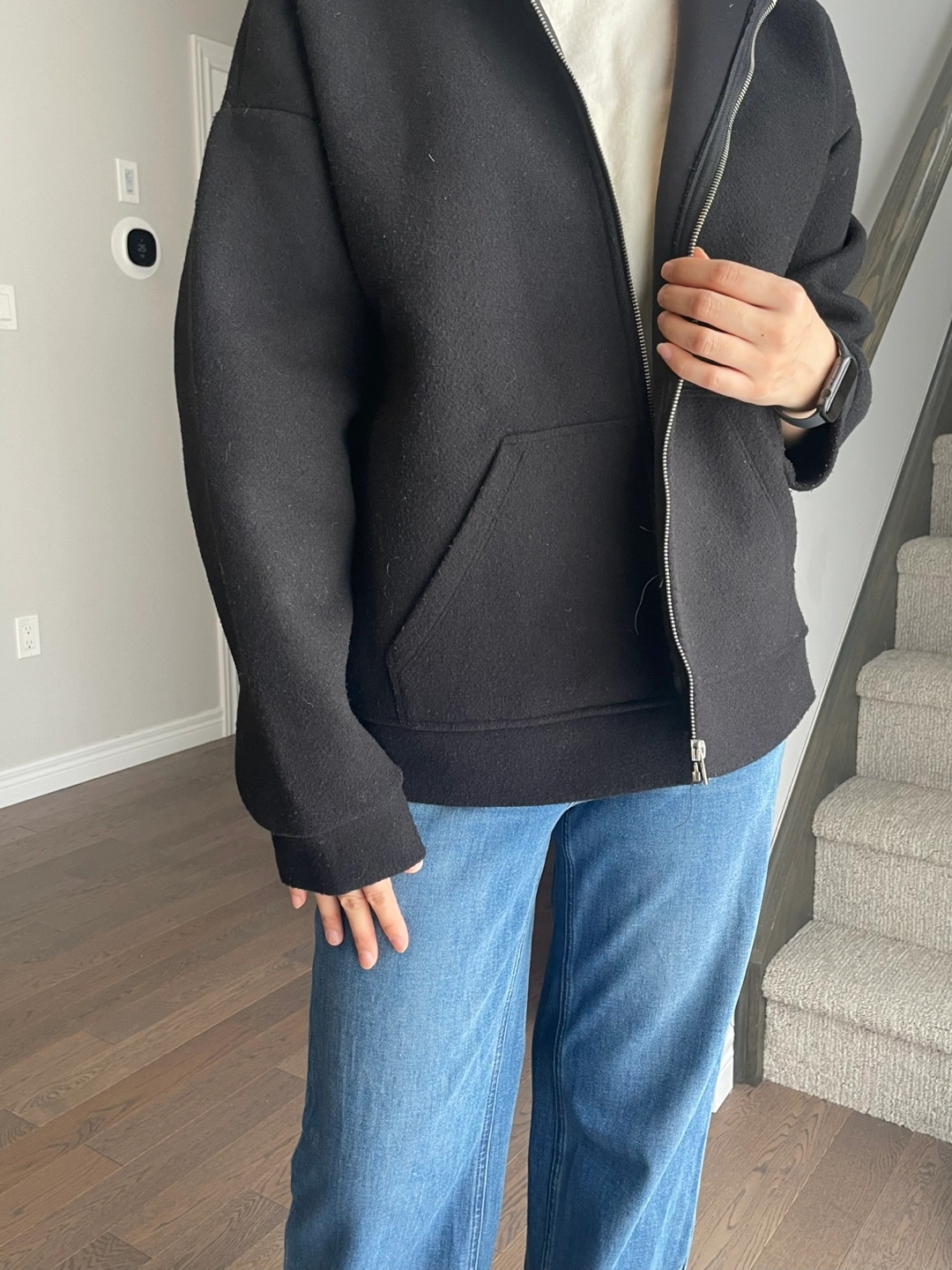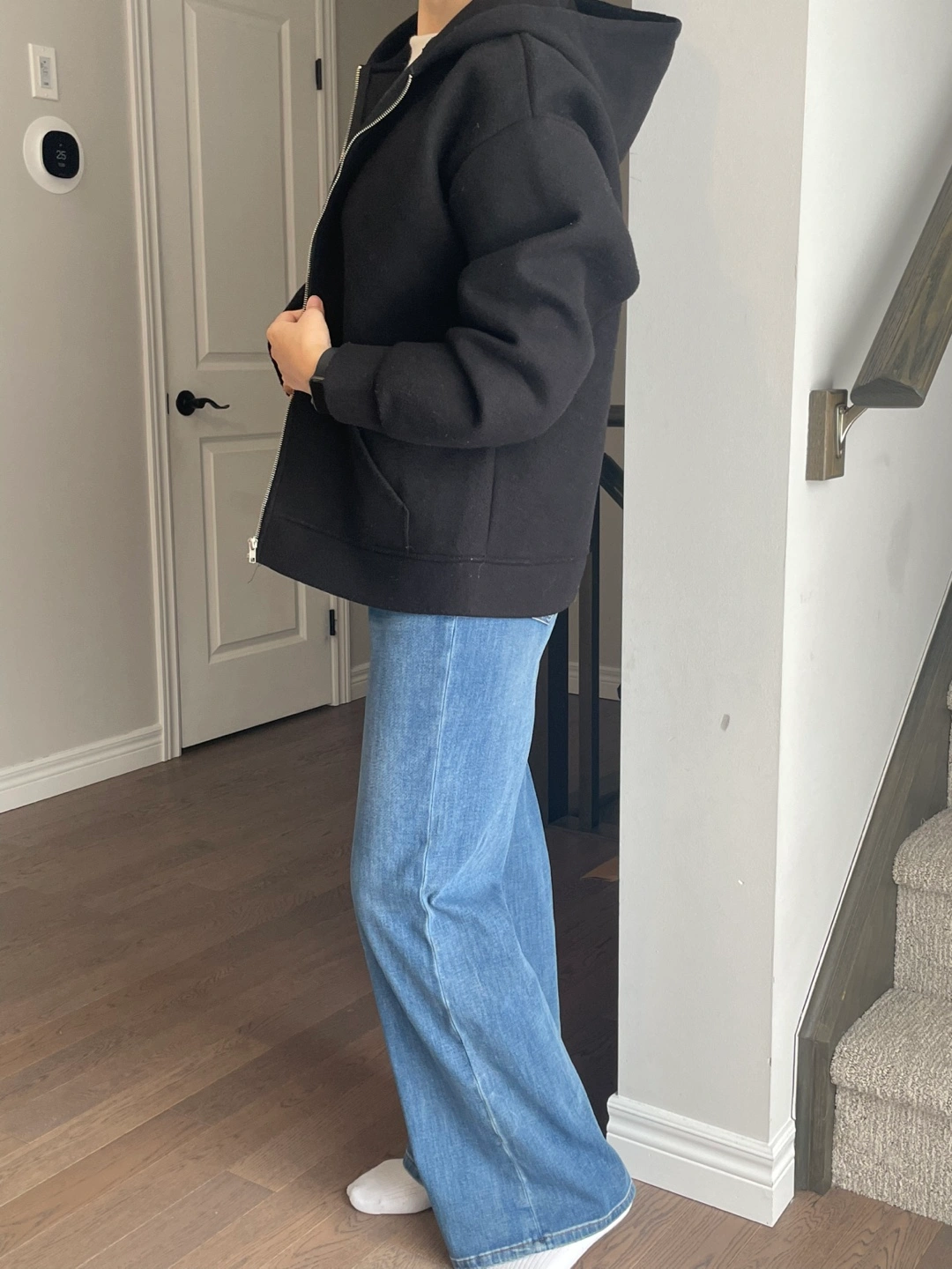 Cozy black zip-up hoodie with a soft feel. It's got a comfortable fit and two front pockets. Perfect for layering on cooler days!