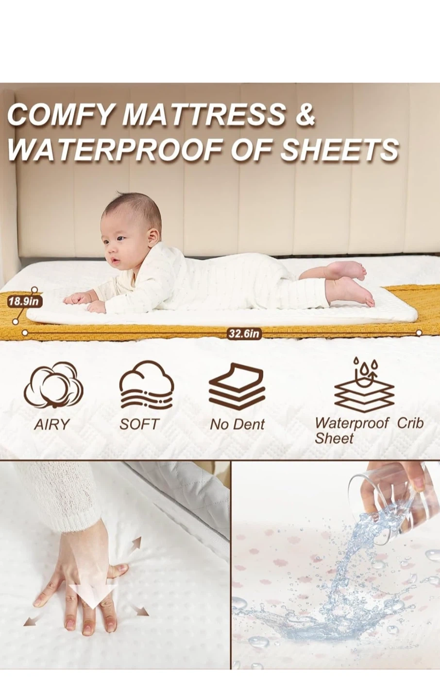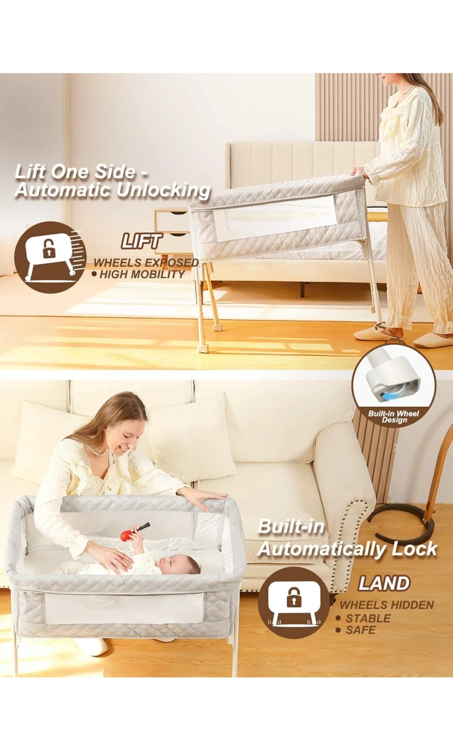 This is a 4 height-adjustable bassinet. It's designed to be non-tilting and stable, with a comfy mattress and waterproof sheets. It features a built-in wheel design for mobility and automatically locks for safety.