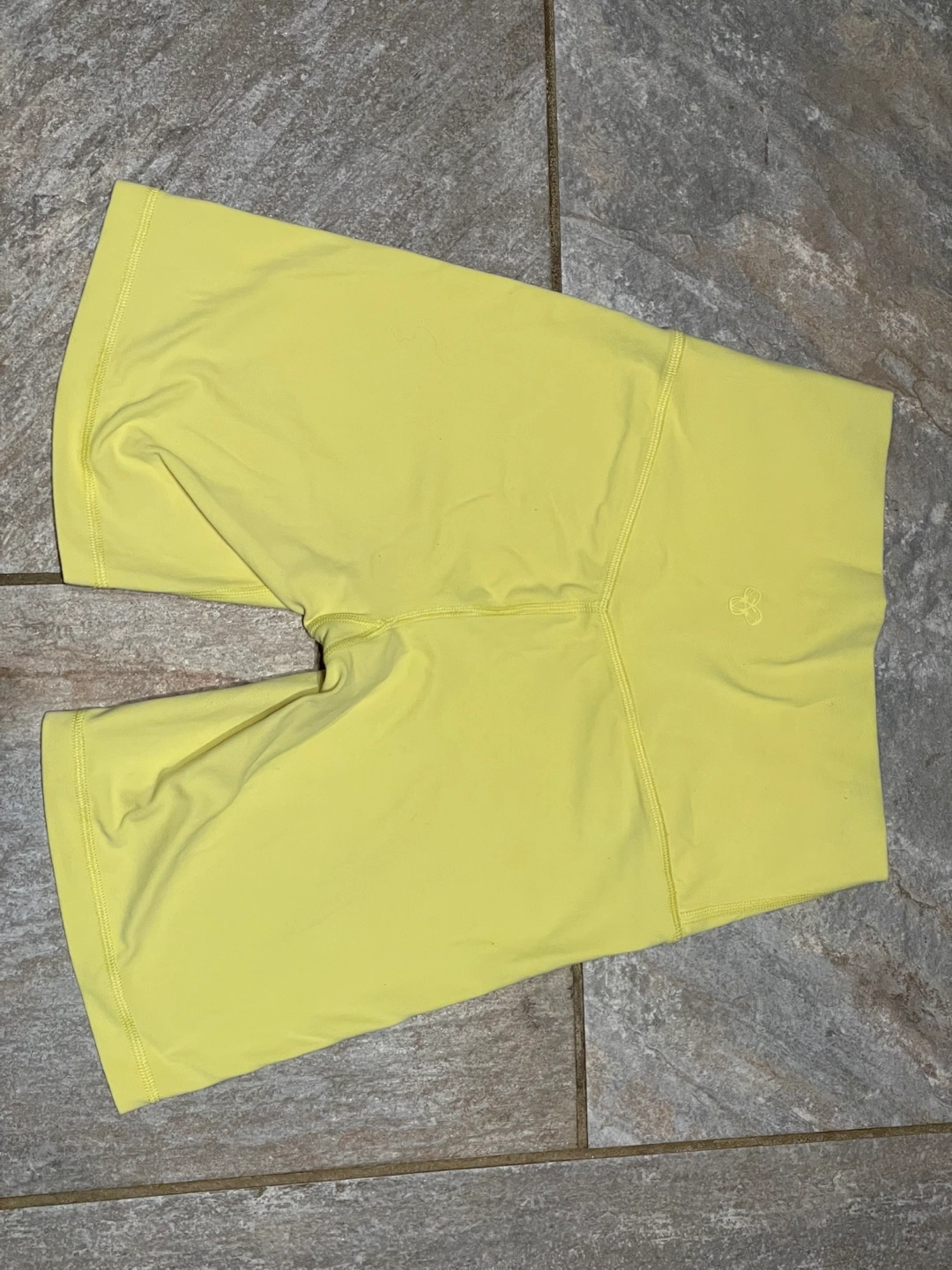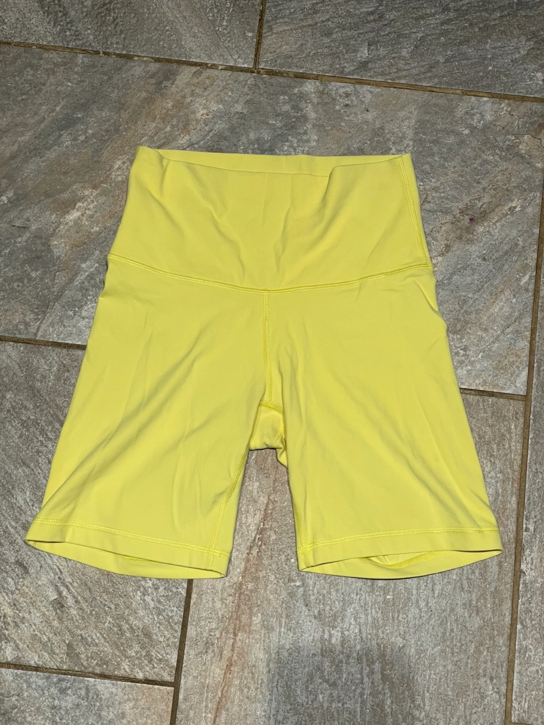 Yellow shorts with a high waist. Shorts are in a solid colour. They would be great for lounging at home or any sport activity, size S.