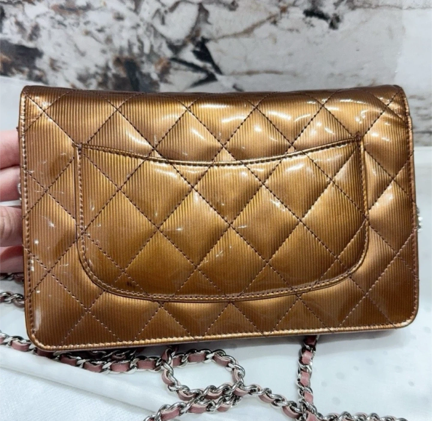 A stylish Chanel wallet on chain in a metallic bronze patent leather. Features the classic diamond quilting with a chain strap. Interior has multiple card slots and zippered compartments.