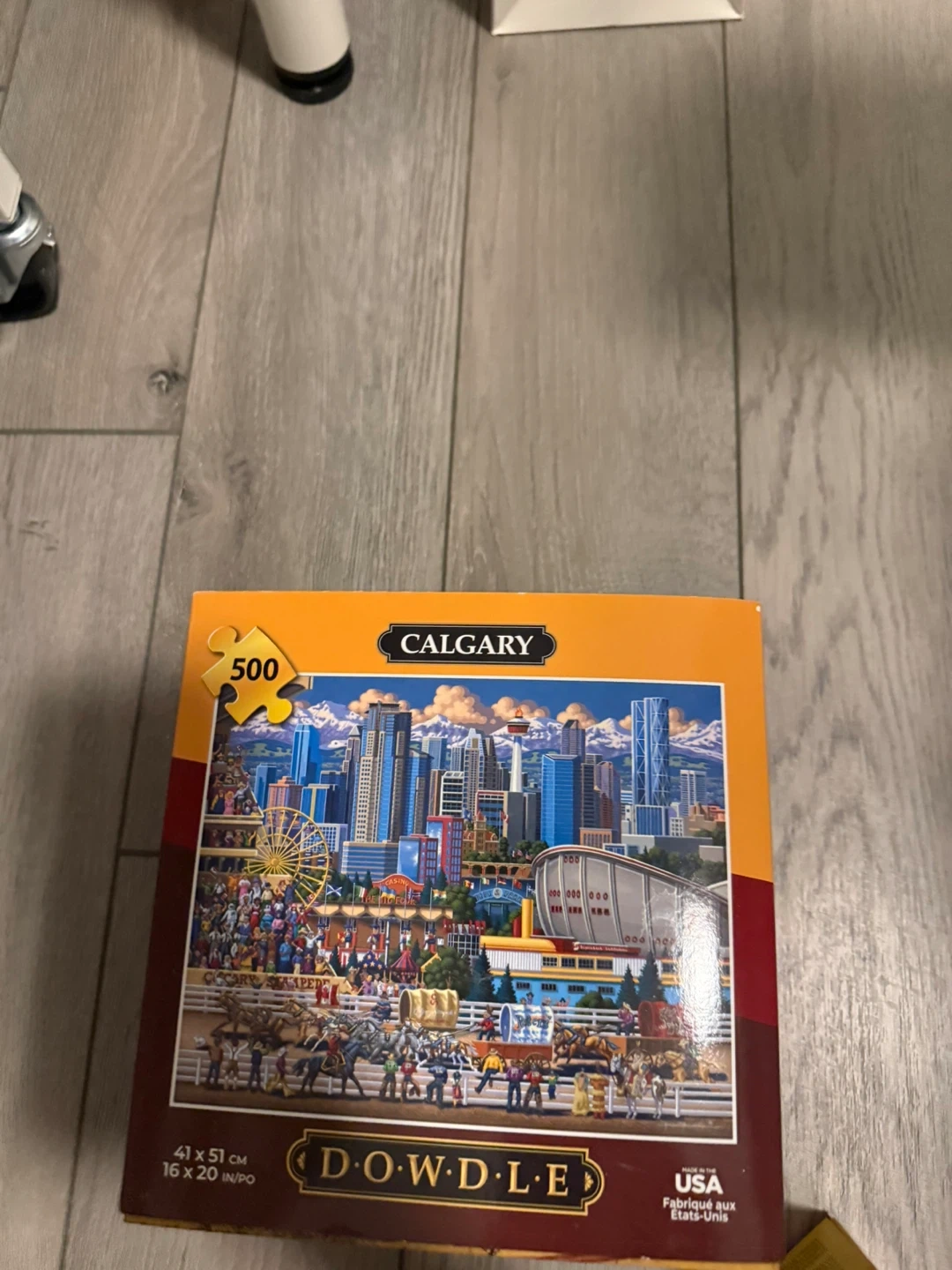 Dowdle 500-piece jigsaw puzzle featuring a Calgary Stampede scene. It measures 41 x 51 cm (16 x 20 inches). Made in the USA.