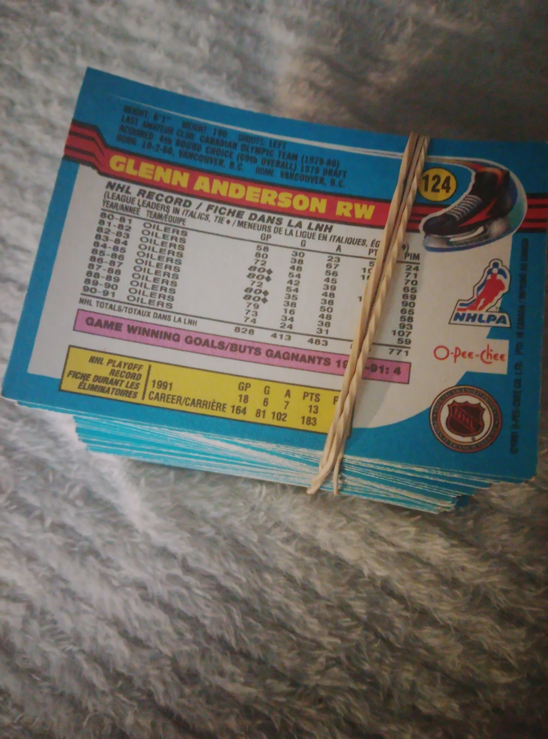 This is a stack of O-Pee-Chee hockey cards, featuring Glenn Anderson. The cards show his NHL stats and career information. They're held together with an elastic band.