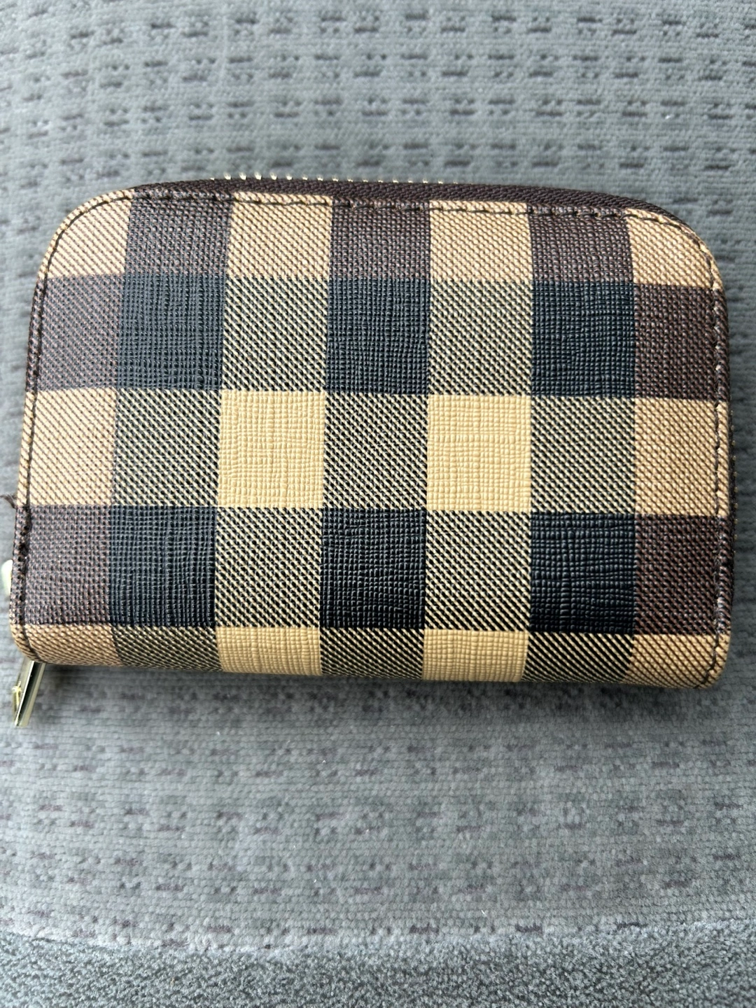 Here's a card holder wallet with a brown plaid design! It's in great condition and ready for a new home
