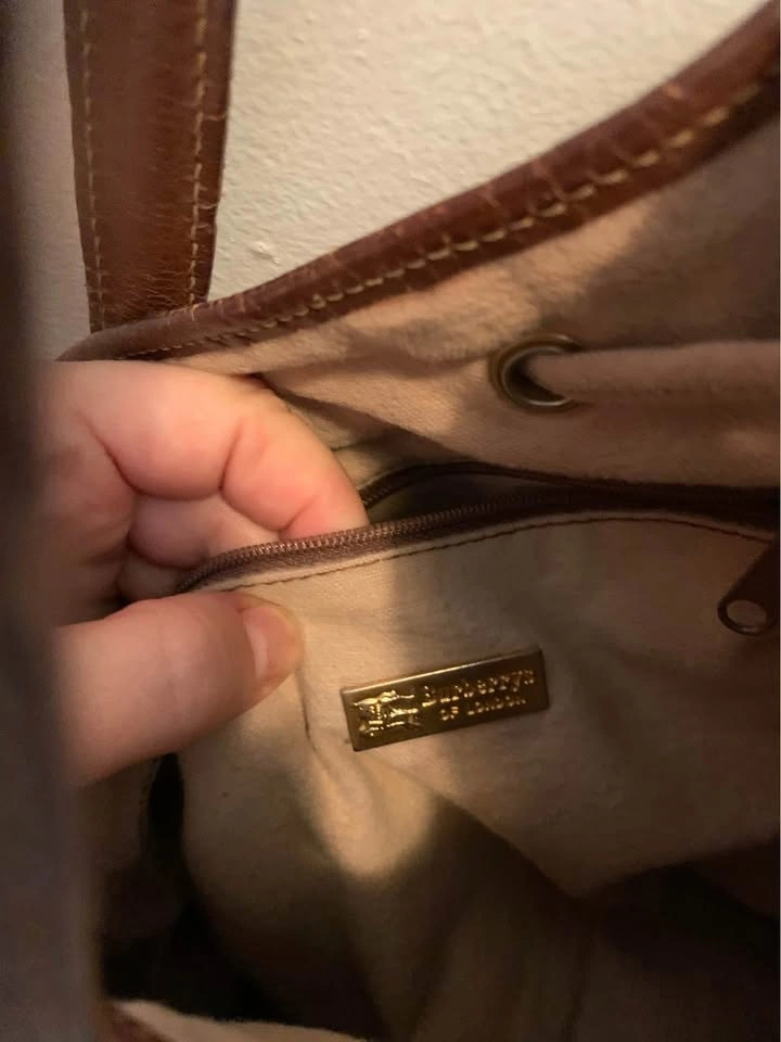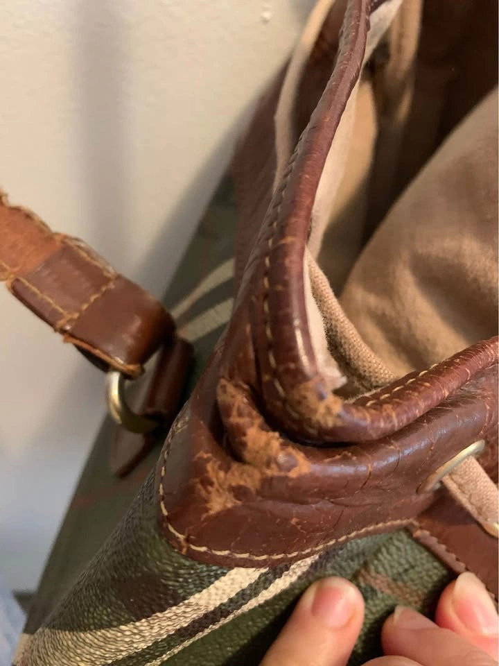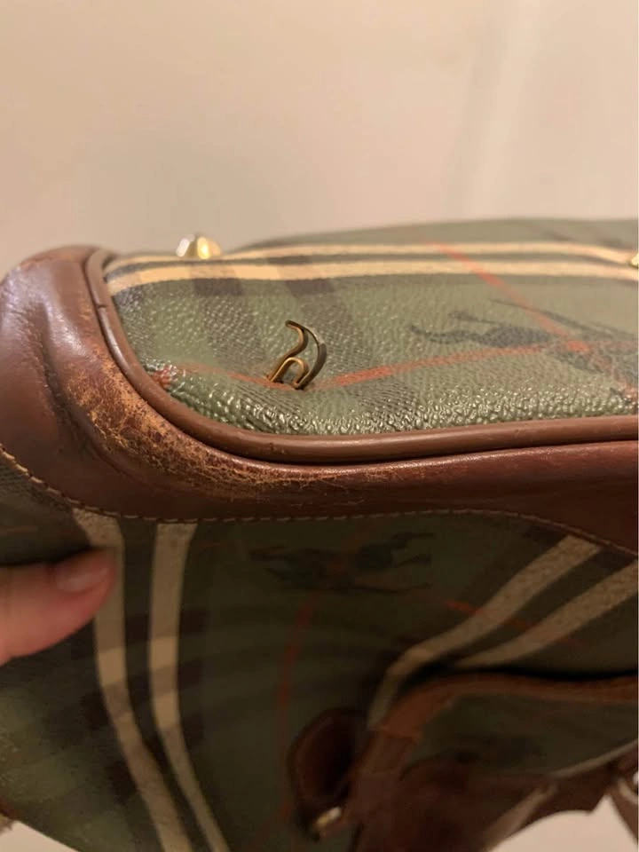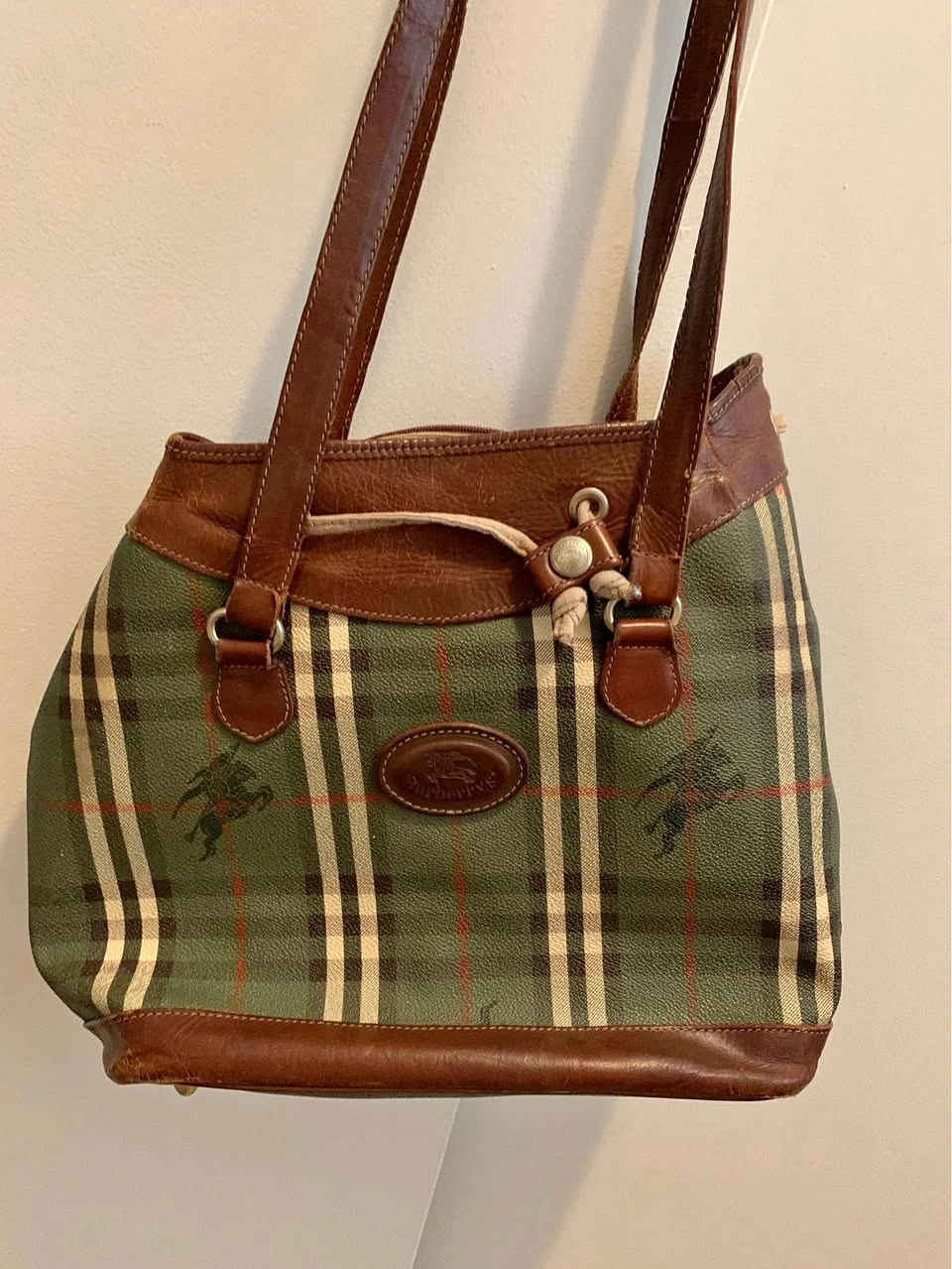 15Beautiful vintage-style checkered tote bag with genuine leather trim. Classic structured shape with drawstring and snap closure. Interior zip pocket and fabric lining. Some wear on the leather and one missing metal foot on the bottom — priced accordingly.