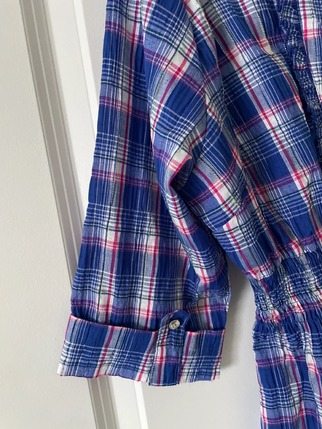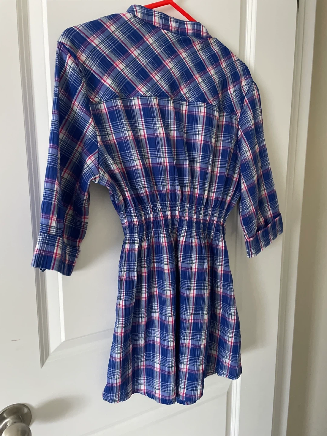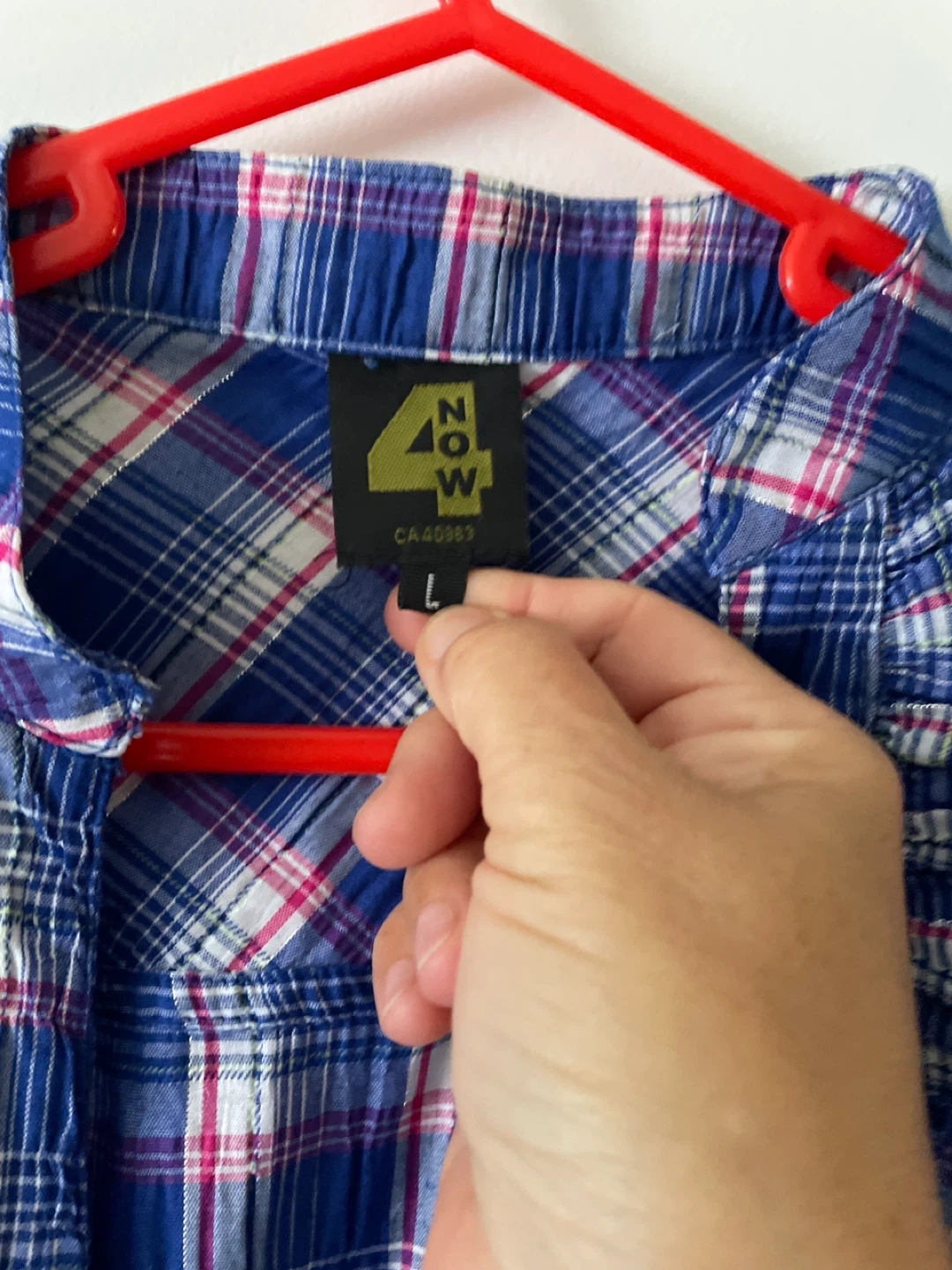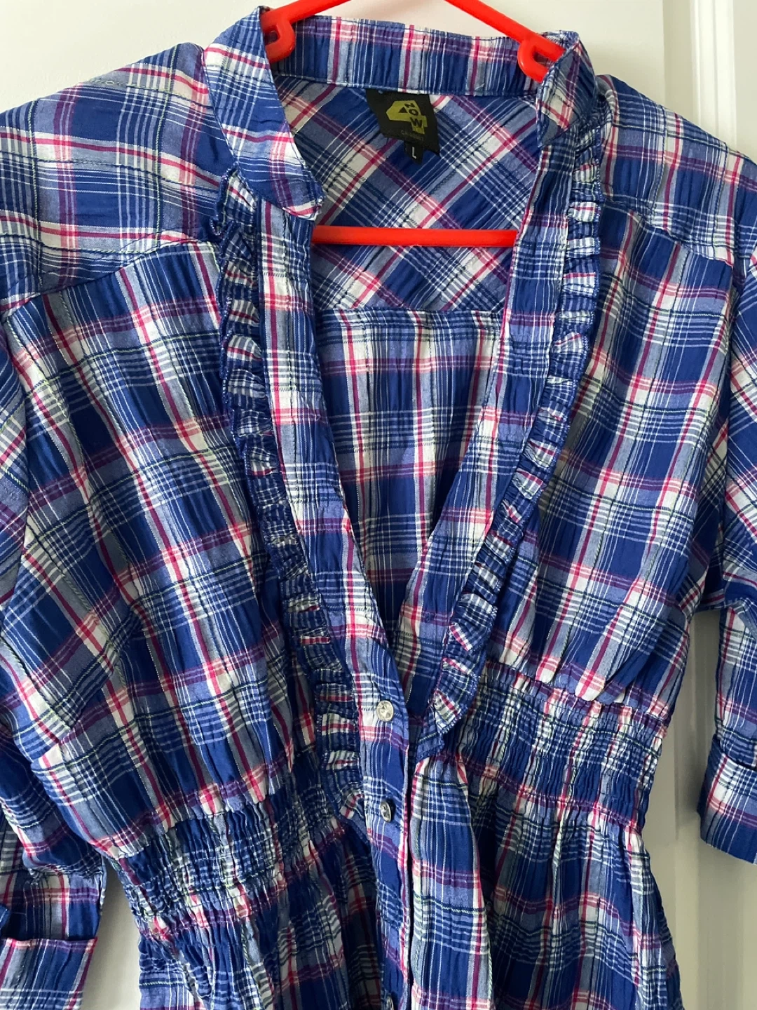 Cute 4 Now shirt dress in a blue, white, and pink plaid pattern! It's a size L and has a cinched waist for a flattering fit. Perfect for a casual day out