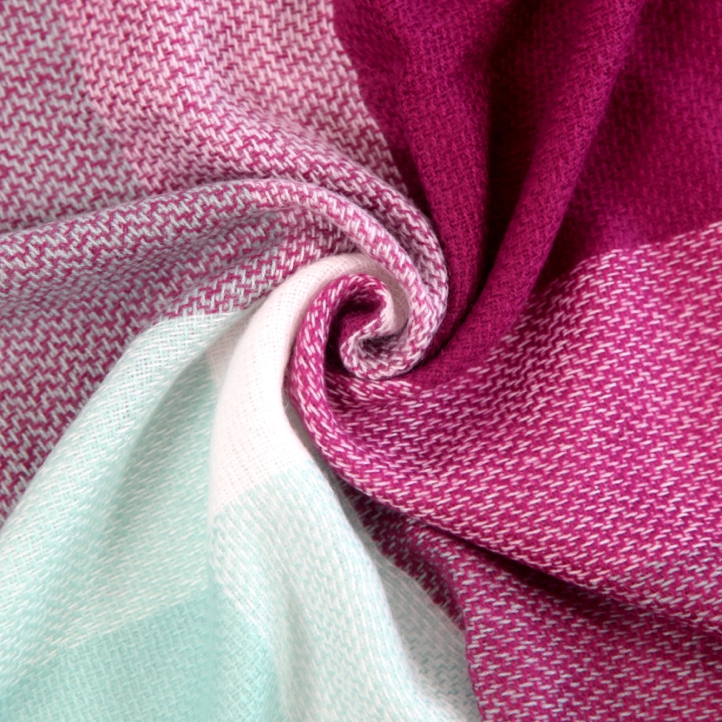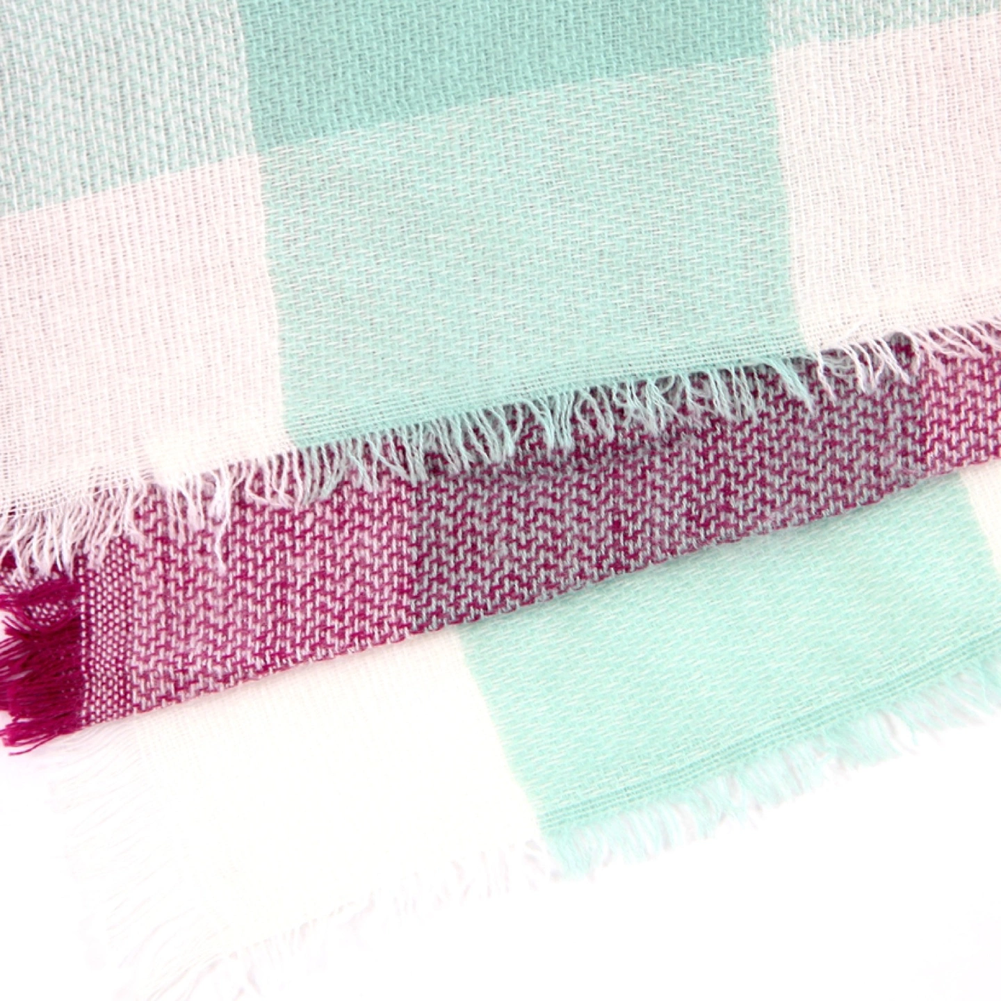 - Large, soft scarf. - Features a colourful plaid pattern in shades of dark purple, mint green, and white. - Frayed edges. - Cute and perfect for cold weather!